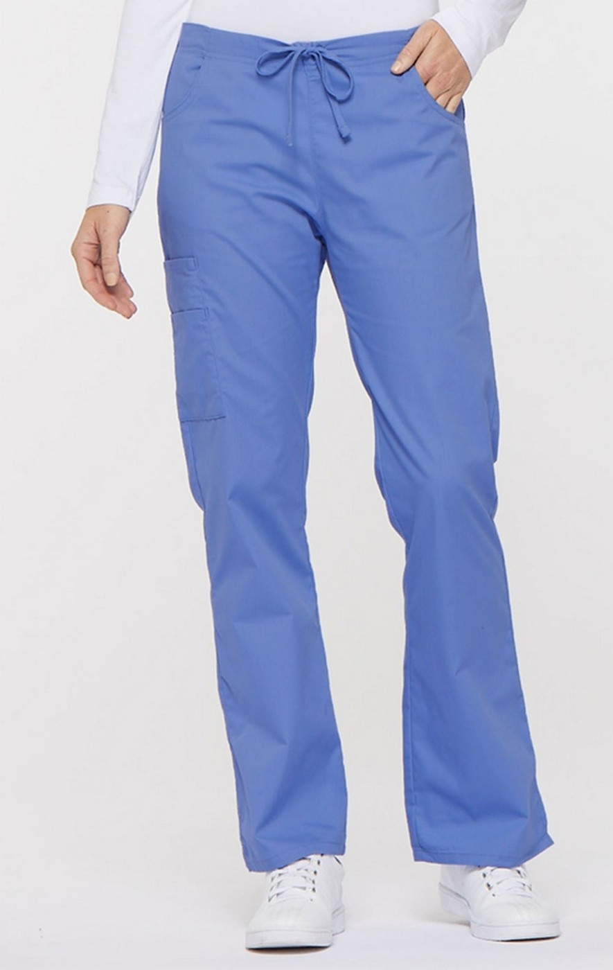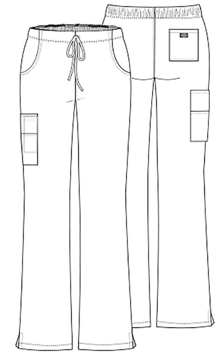 A modern classic fit, mid rise, moderate flare leg pant features an adjustable drawstring with elastic at the back waist and Dickies logo twill tape on the inside back waistband. Also featured are front scoop pockets, a back pocket, cargo pockets with a stretch Red knit interior pocket (White knit pocket on White) and side vents.