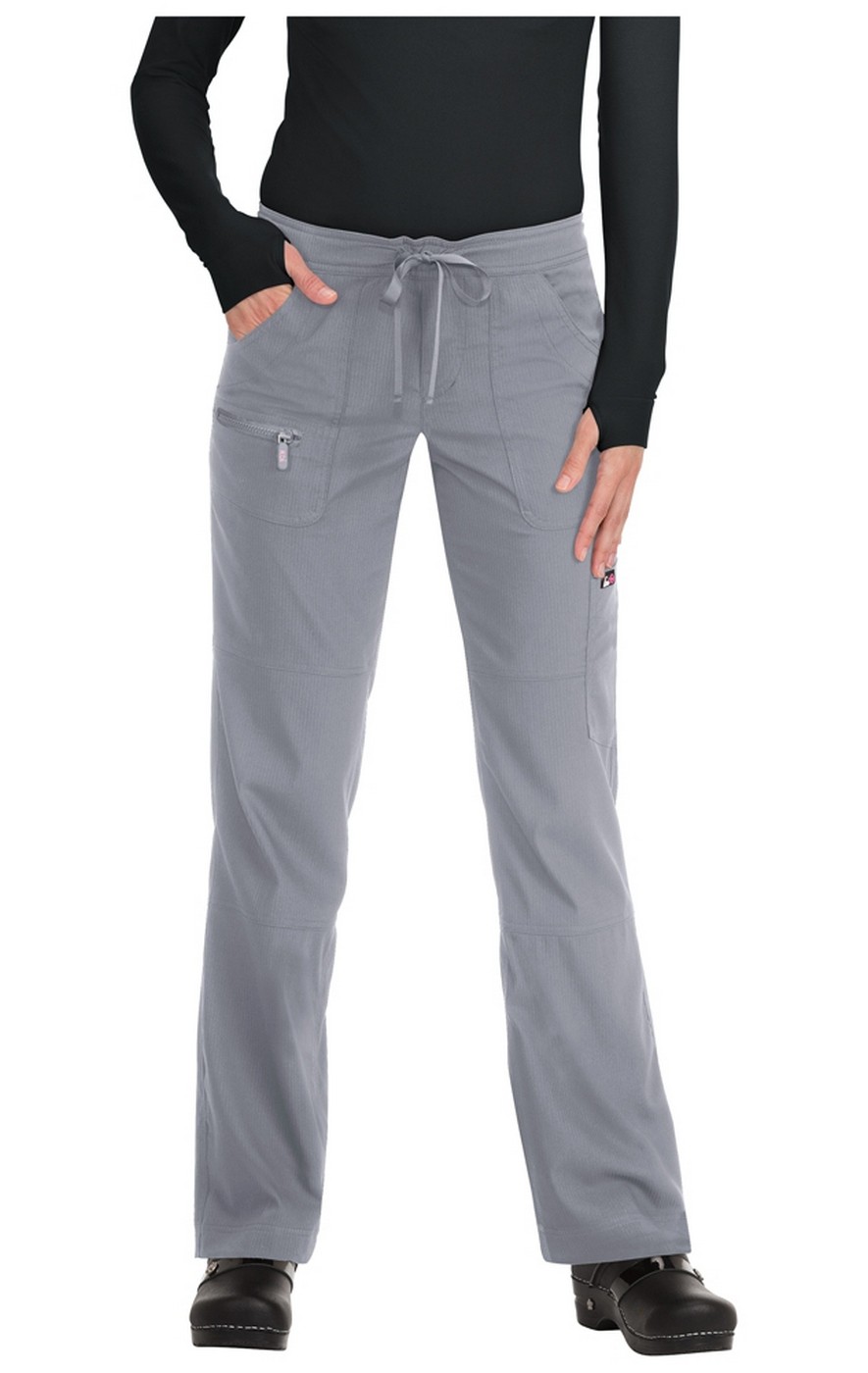 Koi Lite™ Scrubs Peace Drawstring Waist Slim Fit Pant sits slightly below waist and has a grosgrain fabric drawstring tie. This straight leg pant has rib knit trim at the side pockets. Perfect for storage, the Peace scrub pant has six pockets. There are two front pockets, a zipper pocket on the right front pocket, a cargo pocket on left leg and two back pockets featuring the Koi patch logo. Moisture wicking and wrinkle free, the performance stretch fabric is 100% polyester dobby stretch, rib trim 92/8 poly/spandex. The approximate inseam for size M is 28".