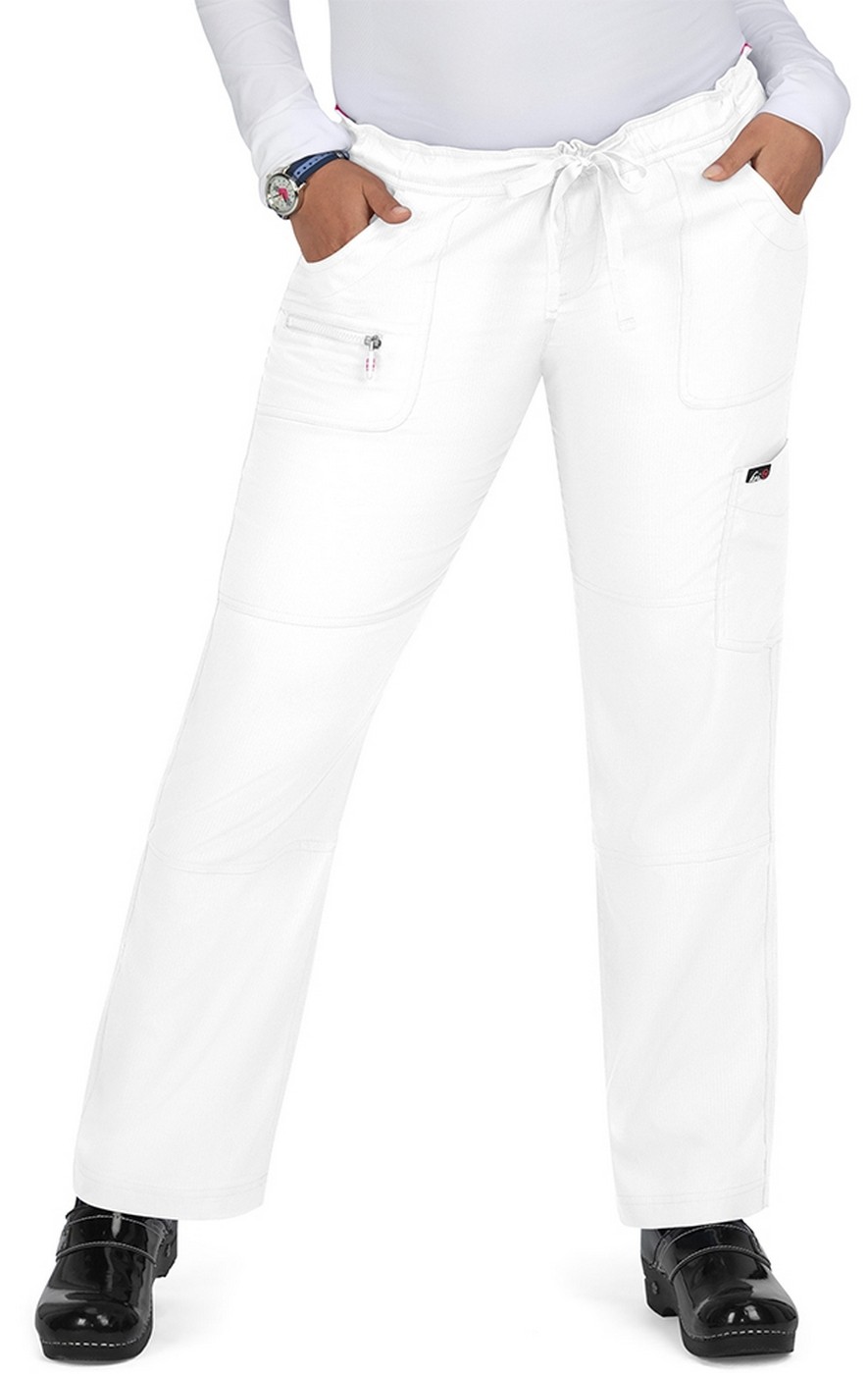 Koi Lite™ Scrubs Peace Drawstring Waist Slim Fit Pant sits slightly below waist and has a grosgrain fabric drawstring tie. This straight leg pant has rib knit trim at the side pockets. Perfect for storage, the Peace scrub pant has six pockets. There are two front pockets, a zipper pocket on the right front pocket, a cargo pocket on left leg and two back pockets featuring the Koi patch logo. Moisture wicking and wrinkle free, the performance stretch fabric is 100% polyester dobby stretch, rib trim 92/8 poly/spandex. The approximate inseam for size M is 28".