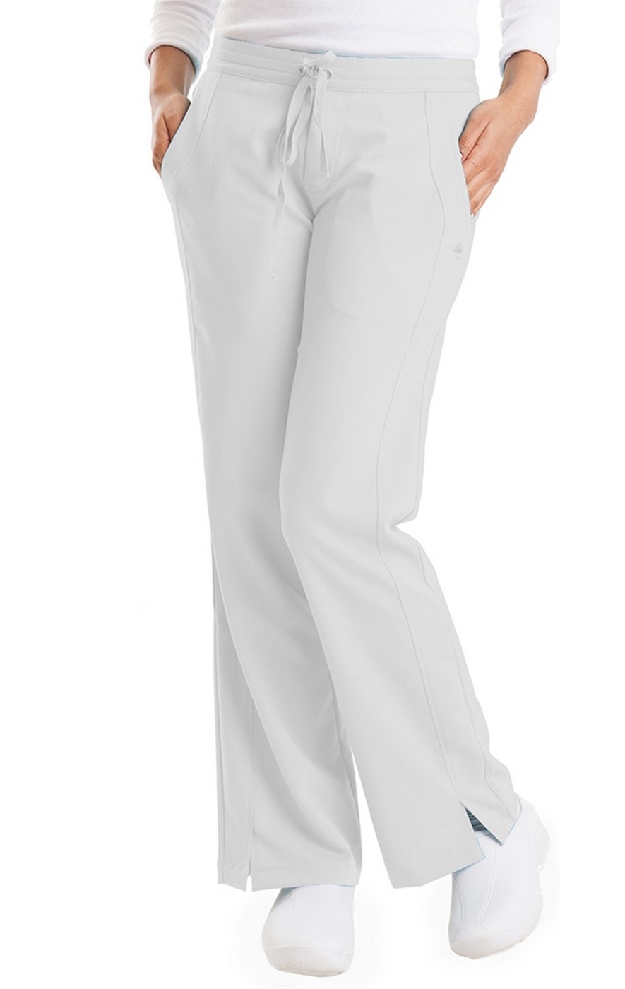 Healing Hands 9095 Junior fit drawstring pant features a mid-rise fit with boot cut legs. This pant has a flat front grommet detail on the drawstring for ease of adjustment. The front features a slimming wrap design which adds no bulk at the sides. There is a wide comfort elastic waistband in the back that stays secure, along with a back yoke detail for a sleek fit. There are two side pockets for storage and side slits for easy access. A dyed to match twill tape drawstring, top stitching detail and a "healing hands" embroidered logo on the pockets complete Healing Hands Taylor Pant. Fabric is 77/20/3 Poly/Rayon/Spandex. The inseam for Petite Length 28".