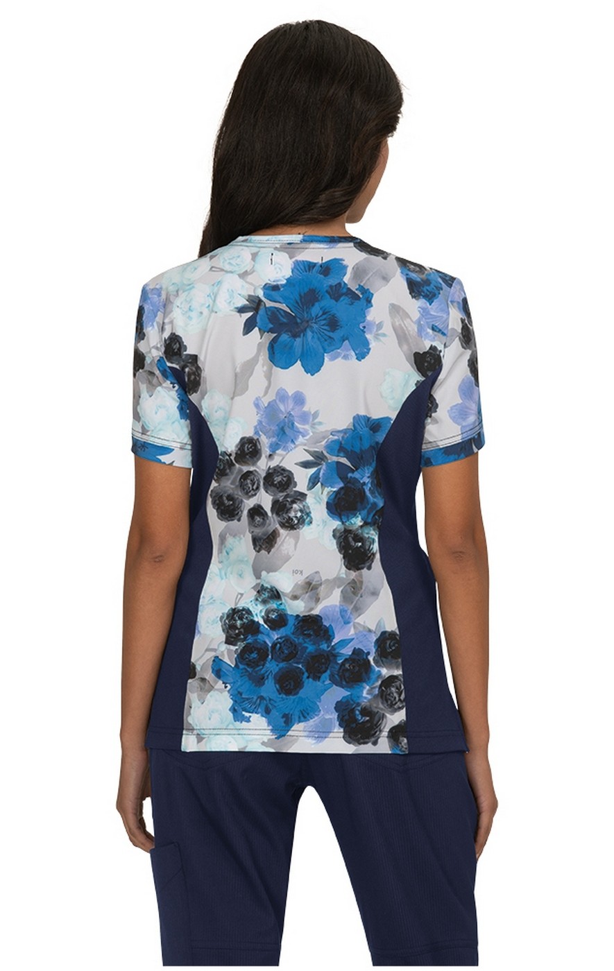You will love the look and fit of this modern print top with stretch rib trim on the sides.