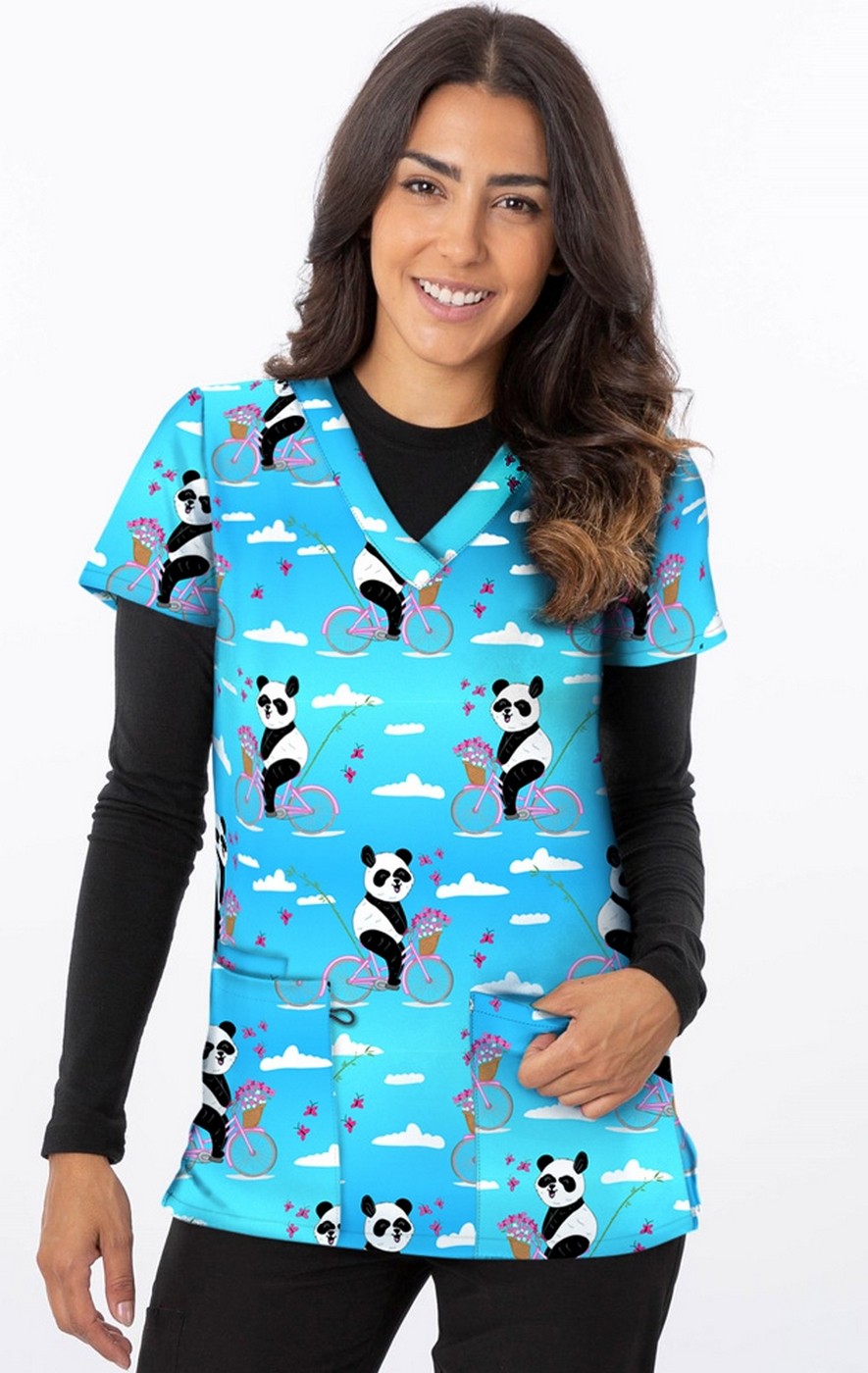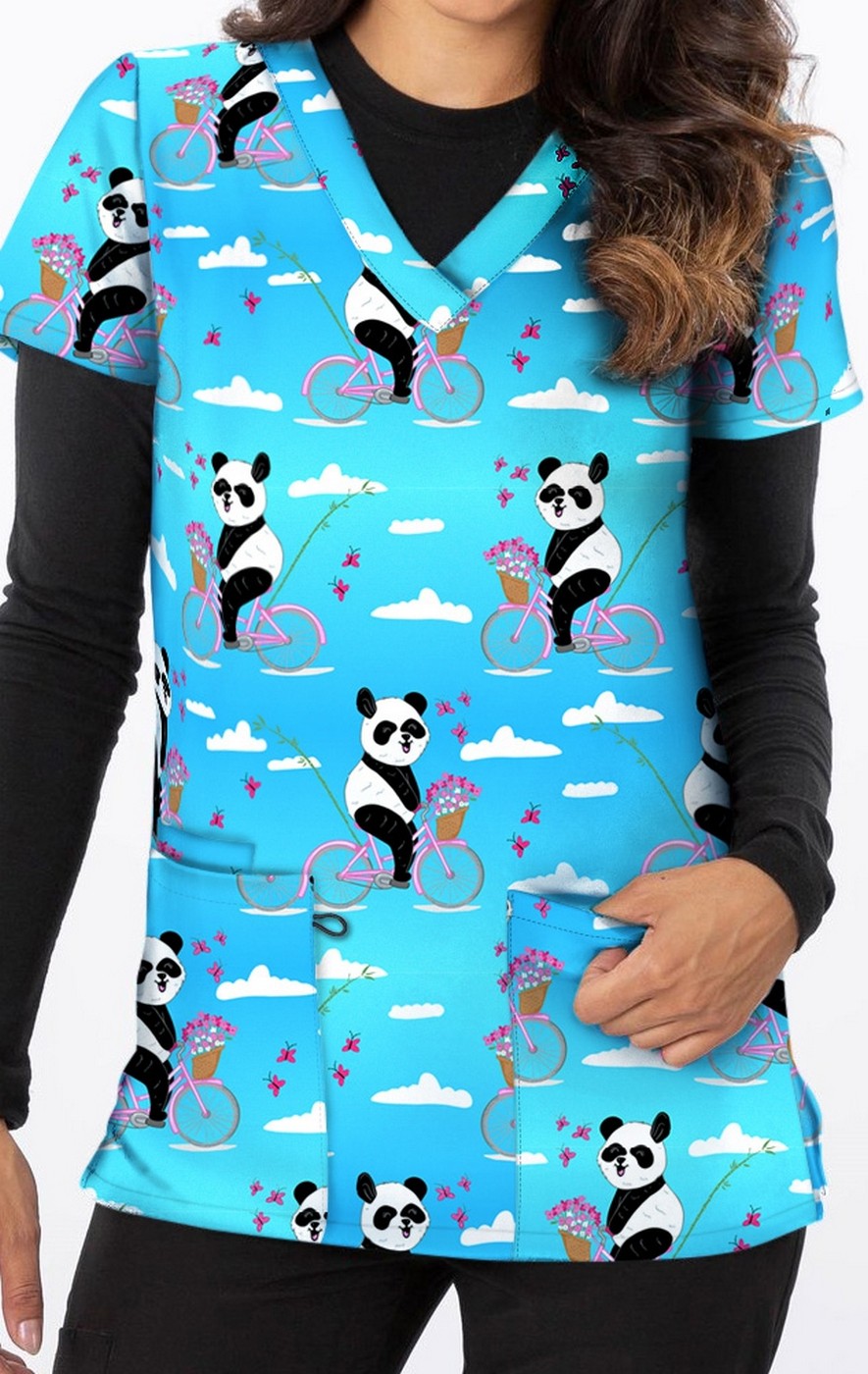 *FINAL SALE 1509BL – PANDA CYCLE Print Scrub Top - Soft Stretch Zinnia Fabric by Greentown