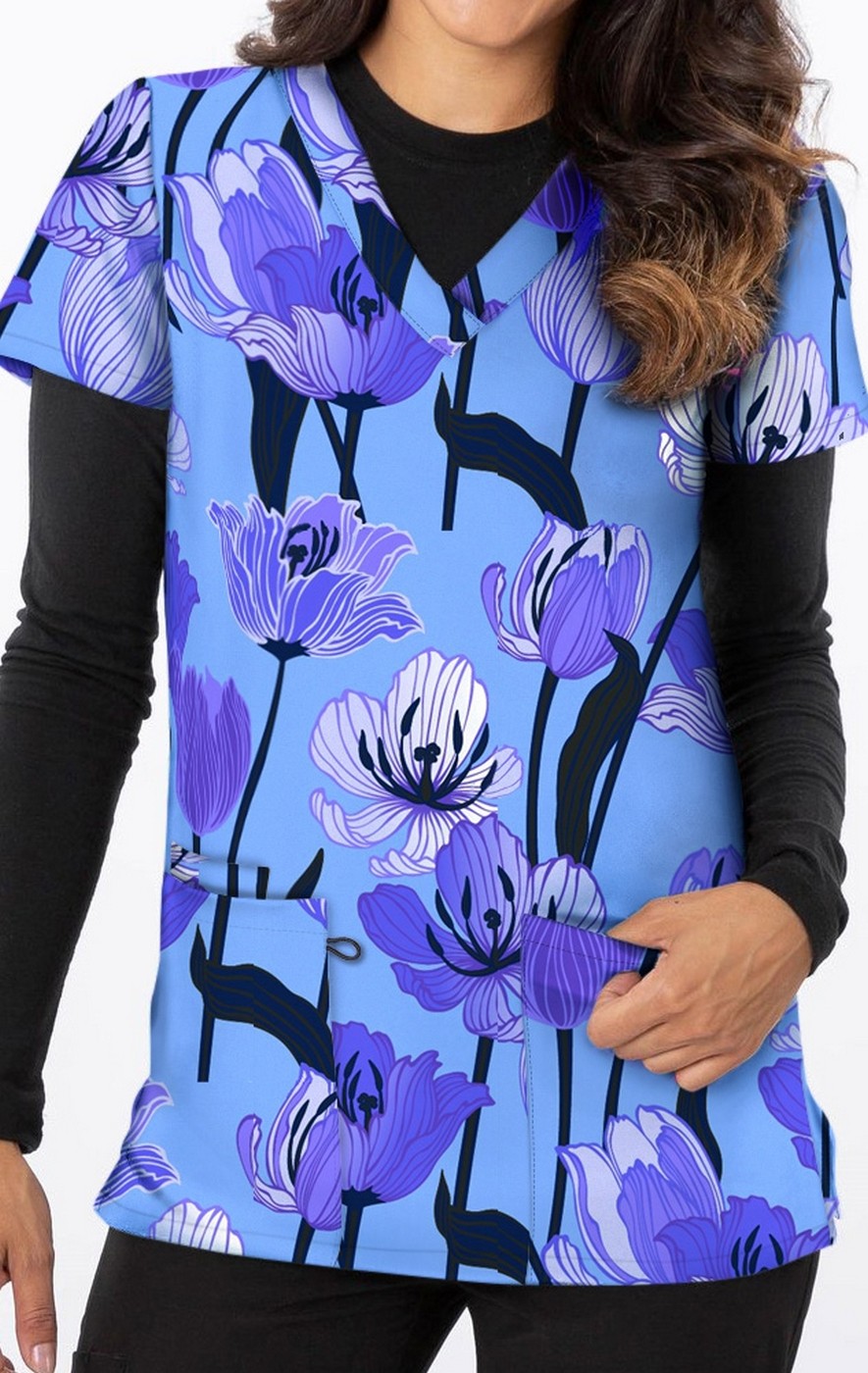 *FINAL SALE 1533BL – Tulips Print Scrub Top - Soft Stretch Zinnia Fabric by Greentown