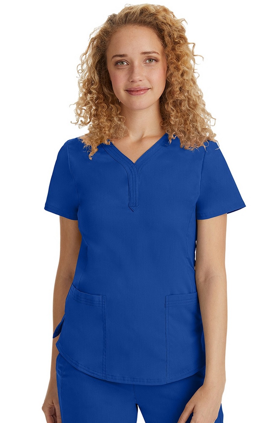 The flattering Jane top from Healing Hands features a "Y" shaped neckline and triple needle stitching on the neckline and pockets. For a superior fit, there is front seam and side slits. A shirt tail hem and a Healing Hands embroidery logo on left front pocket complete this modern fit scrub top.