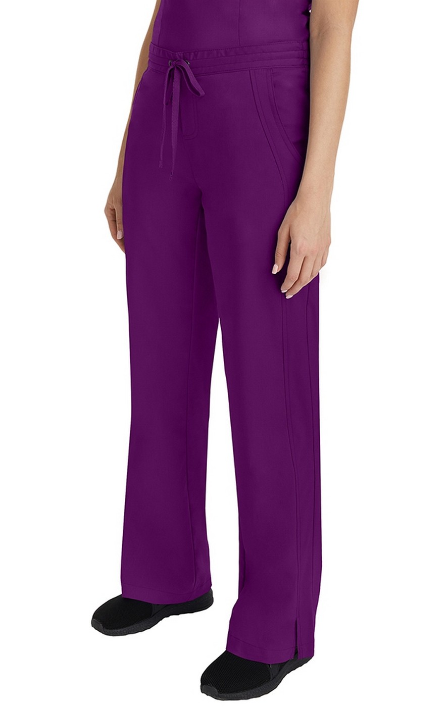 Healing Hands Taylor drawstring pant features a mid-rise fit with boot cut legs. This pant has a flat front grommet detail on the drawstring for ease of adjustment. The front features a slimming wrap design which adds no bulk at the sides. There is a wide comfort elastic waistband in the back that stays secure, along with a back yoke detail for a sleek fit. There are two side pockets for storage and side slits for easy access. A dyed to match twill tape drawstring, top stitching detail and a "Healing Hands" embroidered logo on the pockets complete the look.