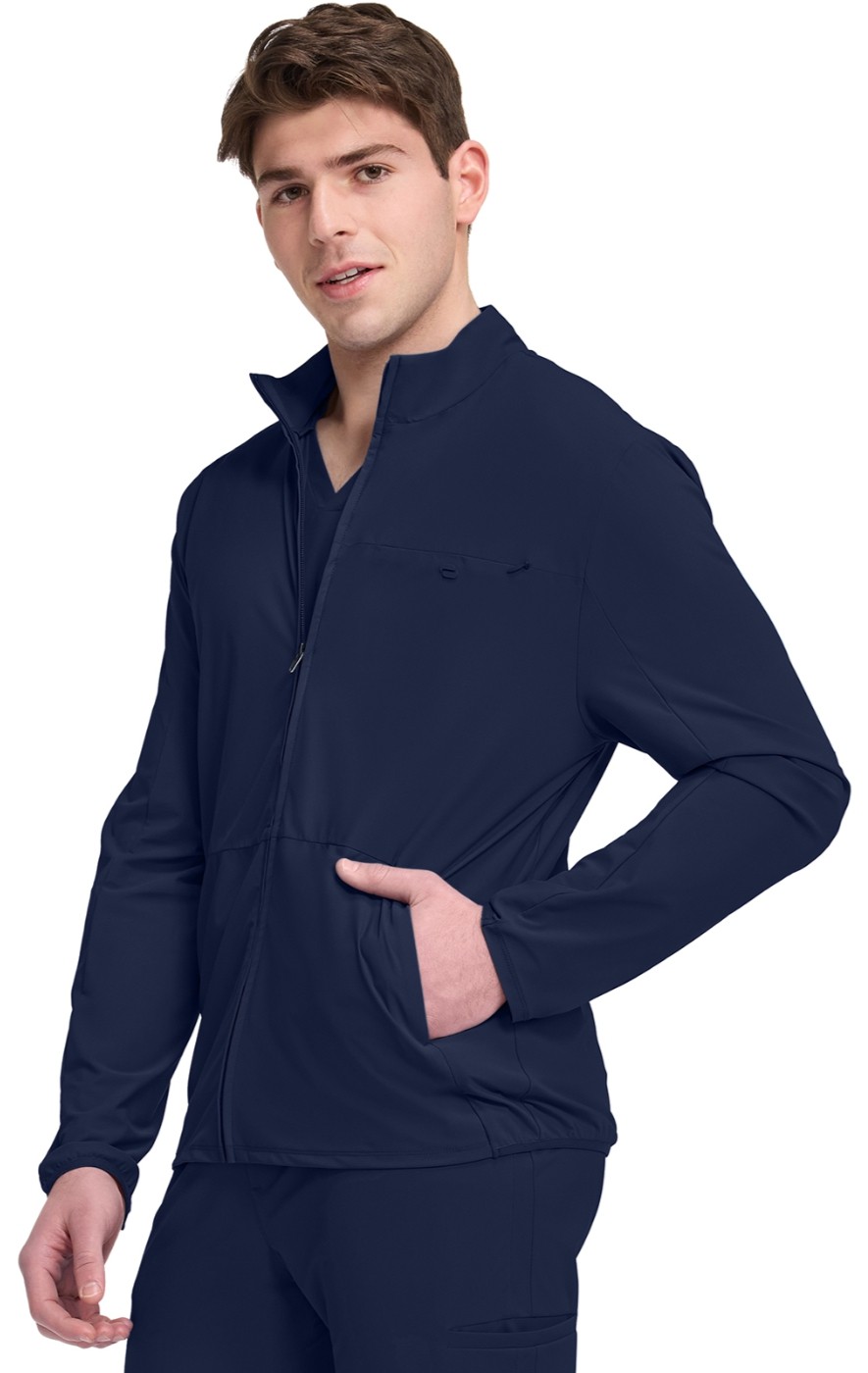 This contemporary-fit warm-up jacket combines style and functionality for ultimate comfort. Featuring a high neckline and long sleeves, it provides warmth and a snug fit. Designed with three pockets: two kangaroo-style and one welt chest pocket this jacket offers plenty of storage space for your essentials. Elastic cuffs and hem ensure a secure, flexible fit that moves with you. Whether you're warming up, cooling down, or simply relaxing, this versatile jacket is a must-have for your active wardrobe.