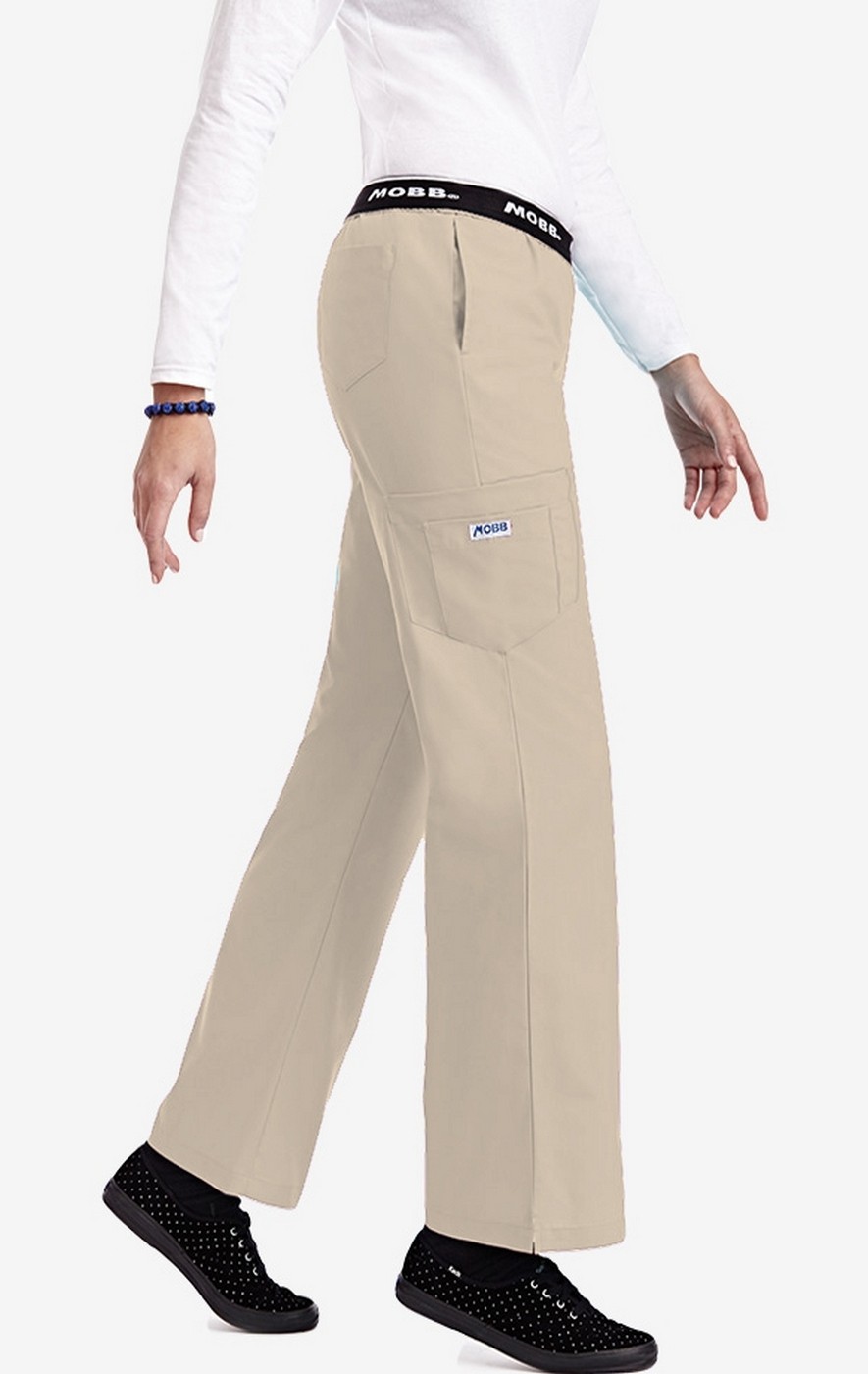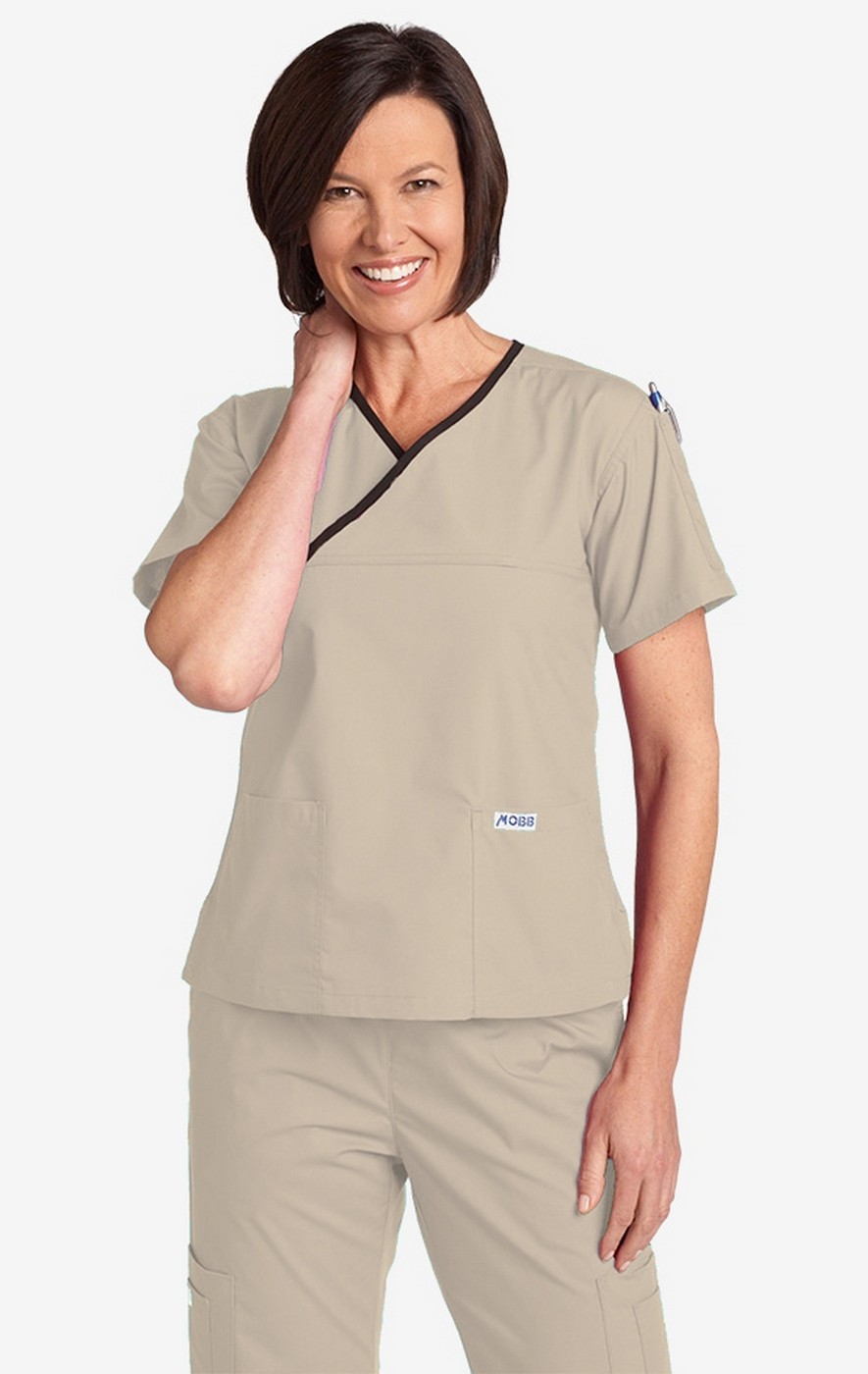 Crossover to MOBB!. The bestselling crossover scrub set in Canada is the MOBB Criss Cross Flip Flap scrub set. THE TOP: Features a V-neck with a contrast color trim as well as two lower pockets and one shoulder pen pocket. THE PANT: Fabulous fit and classic style. This five-pocket boot cut pant features our signature MOBB logo waistband that can be flipped down for a lower rise. Fabric is 65/35 Poly/Cotton.