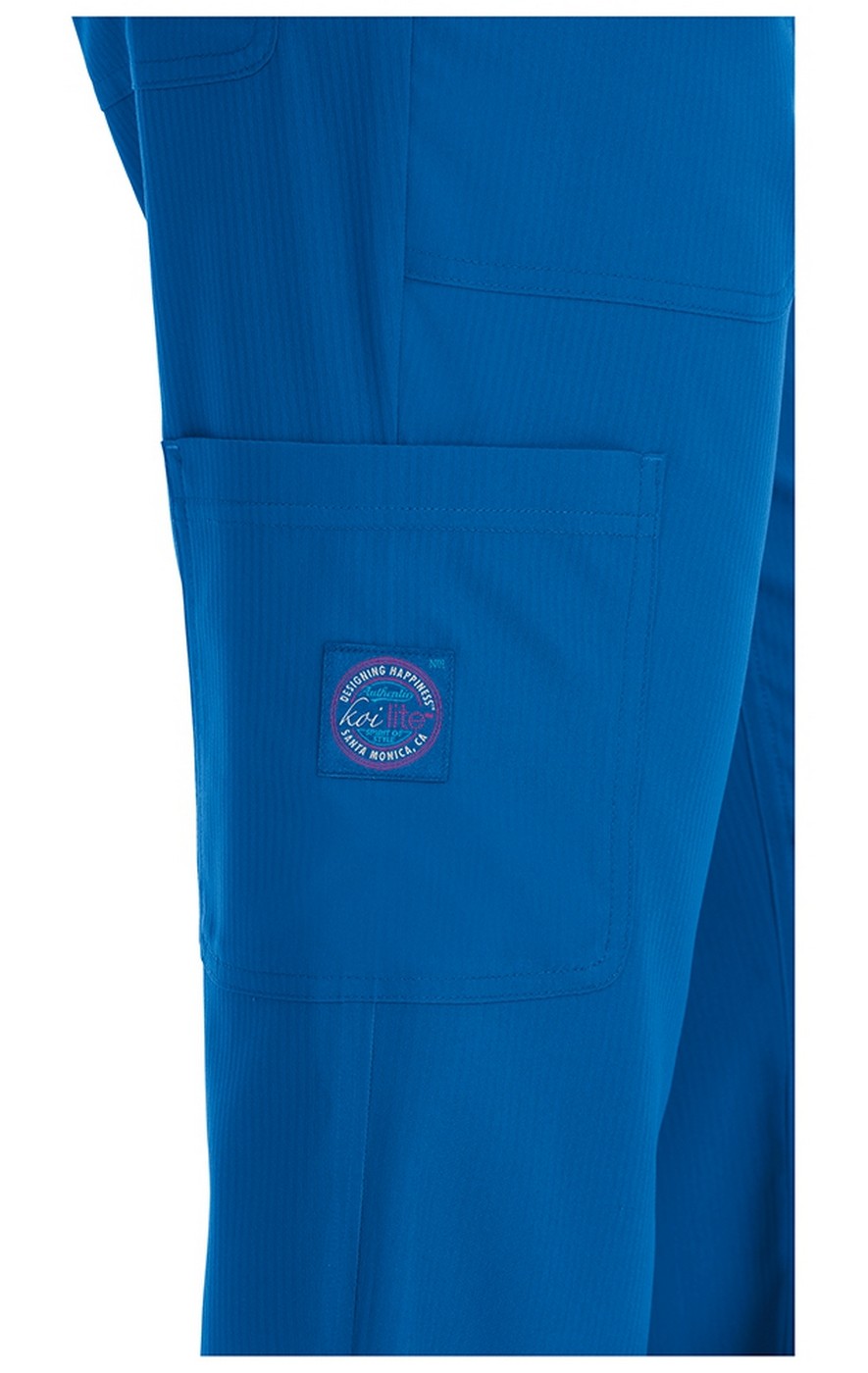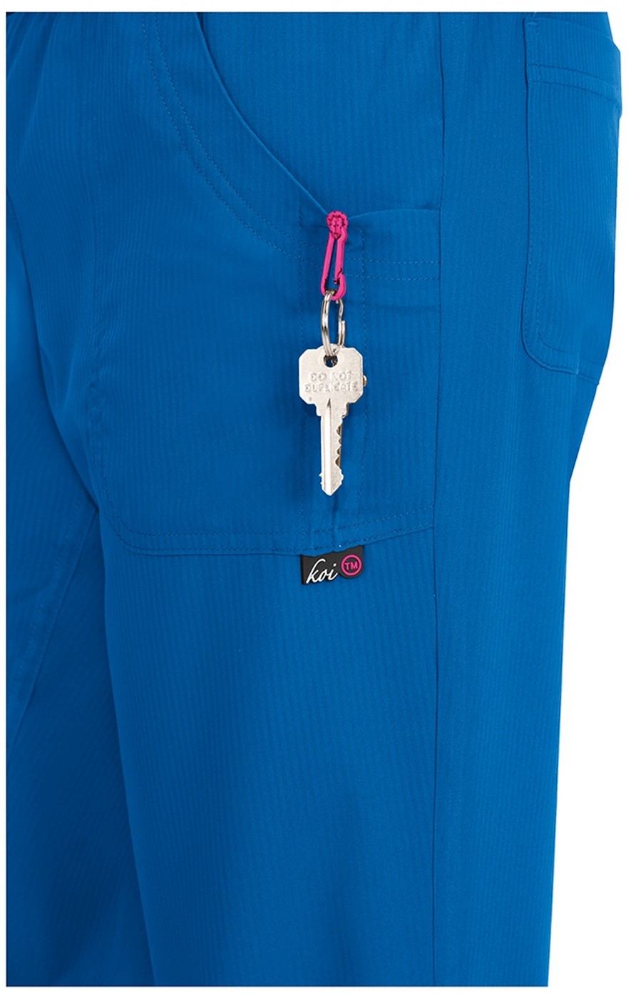 Koi Lite™ Scrubs 720 Spirit Elastic Waist Slim Fit Pant is a mid-rise, straight leg pant. This scrub pant features an adjustable bungee cord at the hem with an inside button to secure cord. Double elastic waistband with Koi logo the bottom band add style to this scrub pant. There's also a contrasting hidden keychain bungee with clip on the left front pocket. These pants are truly a storage lover's dream with two large front pockets, a cargo pocket with a Koi patch logo on the right leg and two back pockets. Moisture wicking and wrinkle free performance stretch fabric is 100% polyester dobby stretch. Rib trim: 92/8 poly/spandex. The approximate inseam for size M is 33".