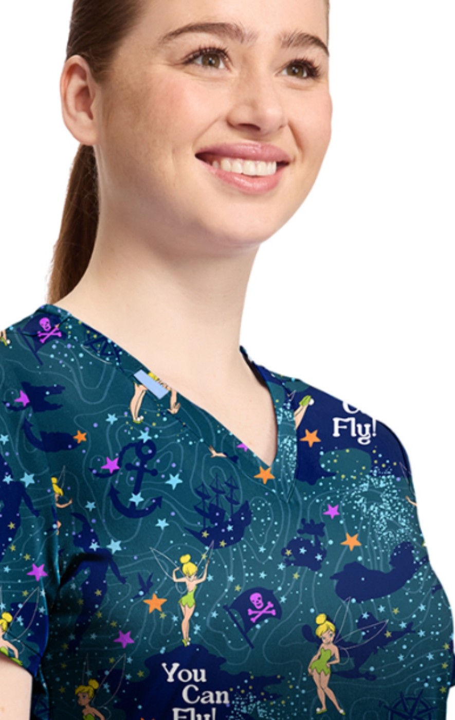 TF796 Tooniforms 2 Pocket V-Neck Print Top by Cherokee - Tinker Bell Flight