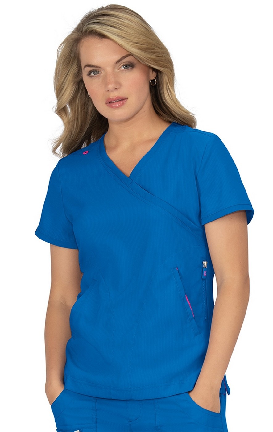 koi Lite's easy wash and wear performance stretch mock-wrap top.