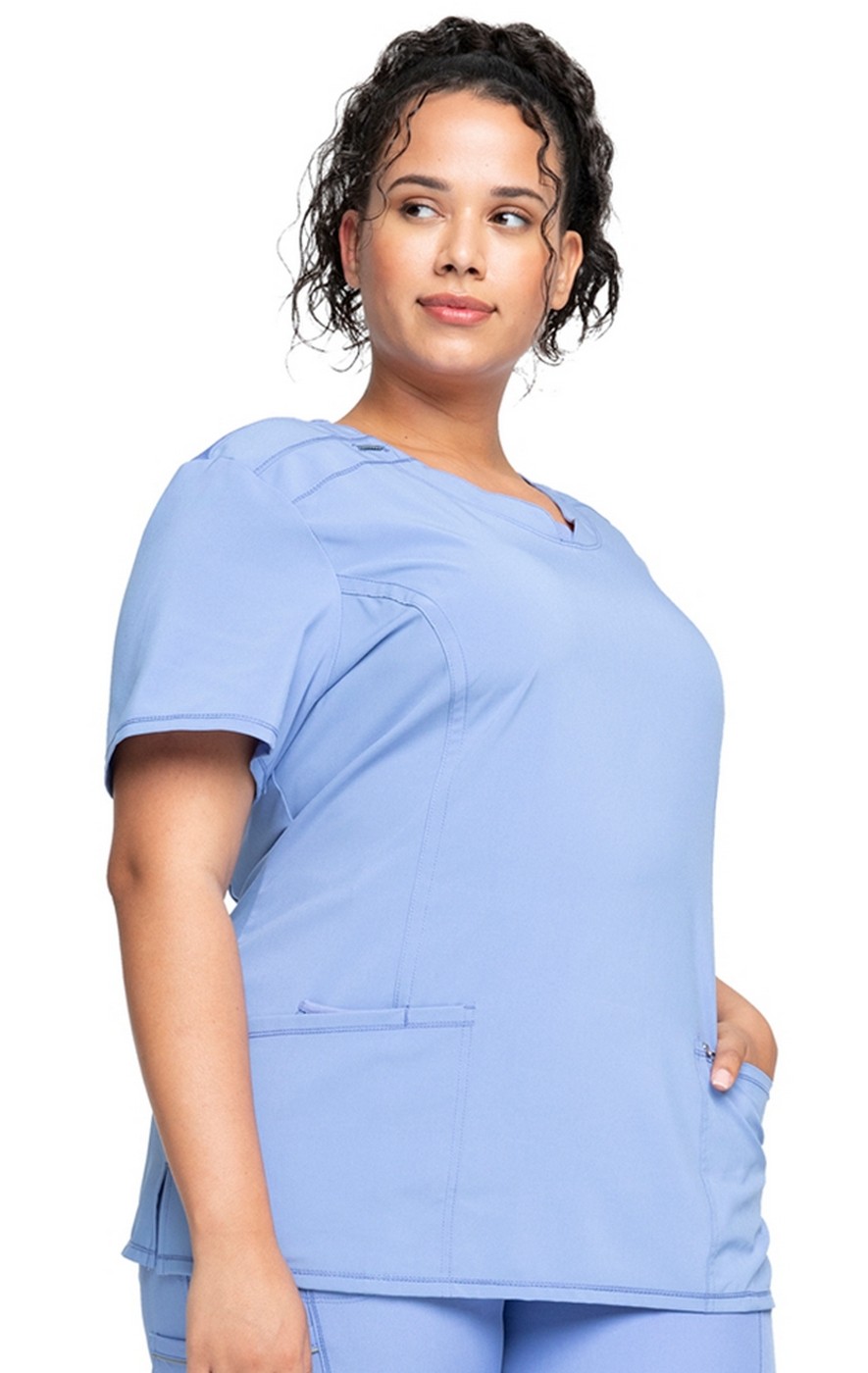 A Contemporary fit round neck top with a rib-knit inset at the front neckband also features shoulder yokes, a bungee ID badge loop on the right shoulder, front and back princess seams, two patch pockets, one interior pocket, and side vents. Stretch rib-knit at the center back panel gives this top its slimming shape and allows for extra movement and comfort. Coverstitch detail throughout. Center back length: 26". The comfortable stretch poplin fabric and super stretchy rib knit are the perfect combos for healthcare professionals.