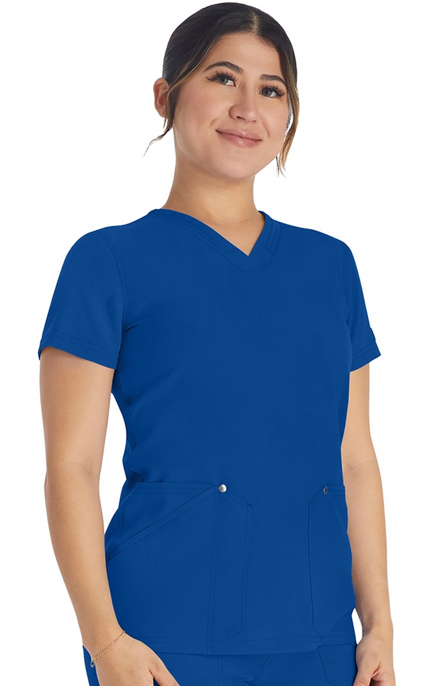 The details don't disappoint on this contemporary fit v-neck top. There is decorative stitching on the neckband plus decorative topstitching on all seams for added style. Four pockets create organized storage with double patch pockets on each side (right features a pen/instrument slot). Decorative logo snaps at pocket corners. A back yoke completes the look.