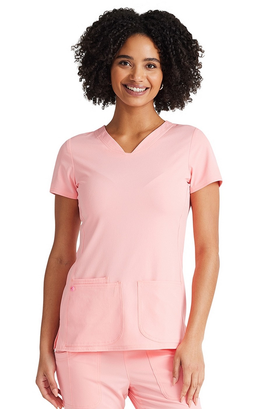 A Contemporary fit V-neck top features rounded patch pockets with a small interior pocket, an exterior pink bungee loop and a hidden functional pink grommet and bungee loop to thread headphone cords through the inside. Also featured is double needle topstitching, a signature woven tape at the back neck, front and back princess seams and side vents.