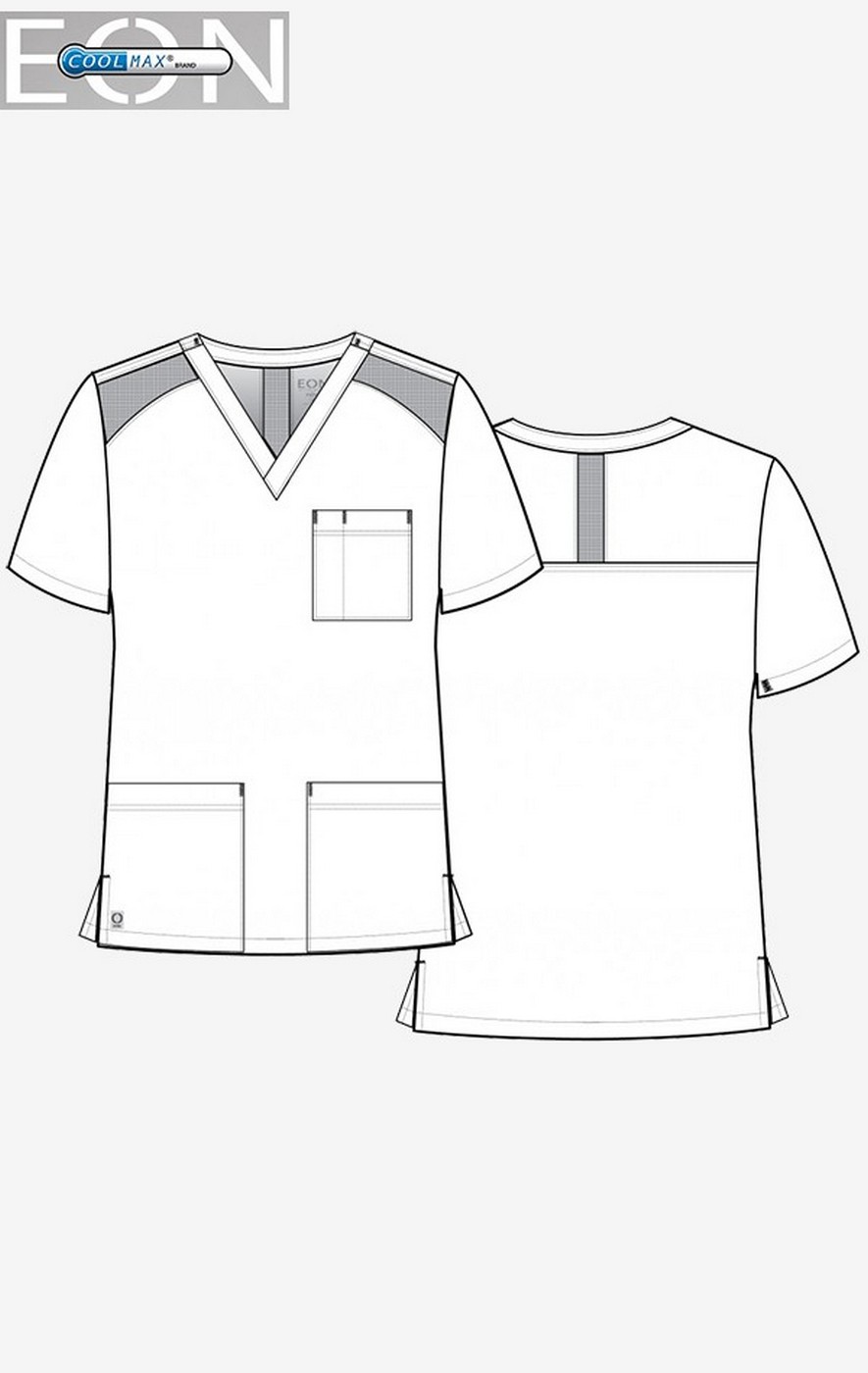 The Maevn EON 5308 men's scrub top features a v-neckline and curved mesh panels along the shoulders and back of neck. For storage, you will find one chest pocket with a pen slot, two front patch pockets, and one additional hidden inner pocket. The side slits provide easy mobility around the workplace.