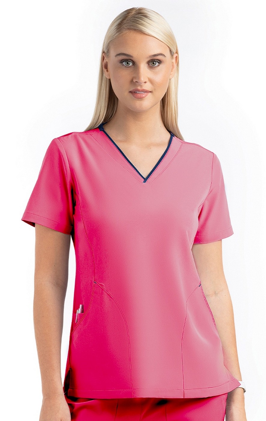 - Women’s V-neck top with contrast/DTM back neck band