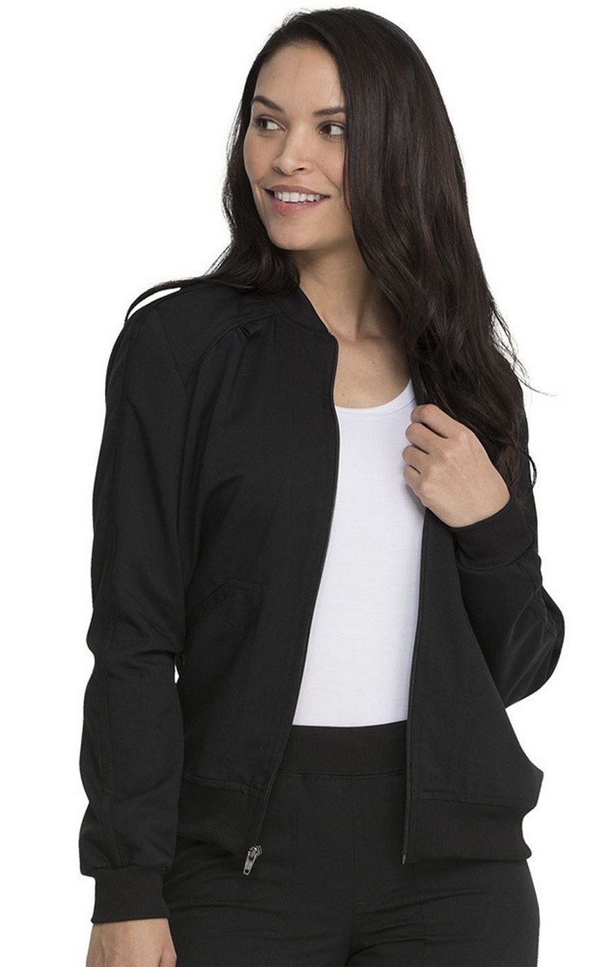 Our contemporary fit zip front jacket features two welt pockets with decorative top stitching and shoulder yokes. Perfectly located at the neck we offer a rib knit collar, rib knit cuffs and rib knit waistband for needed comfort and sleeve strapping for added fashion. Dickies tonal woven label.