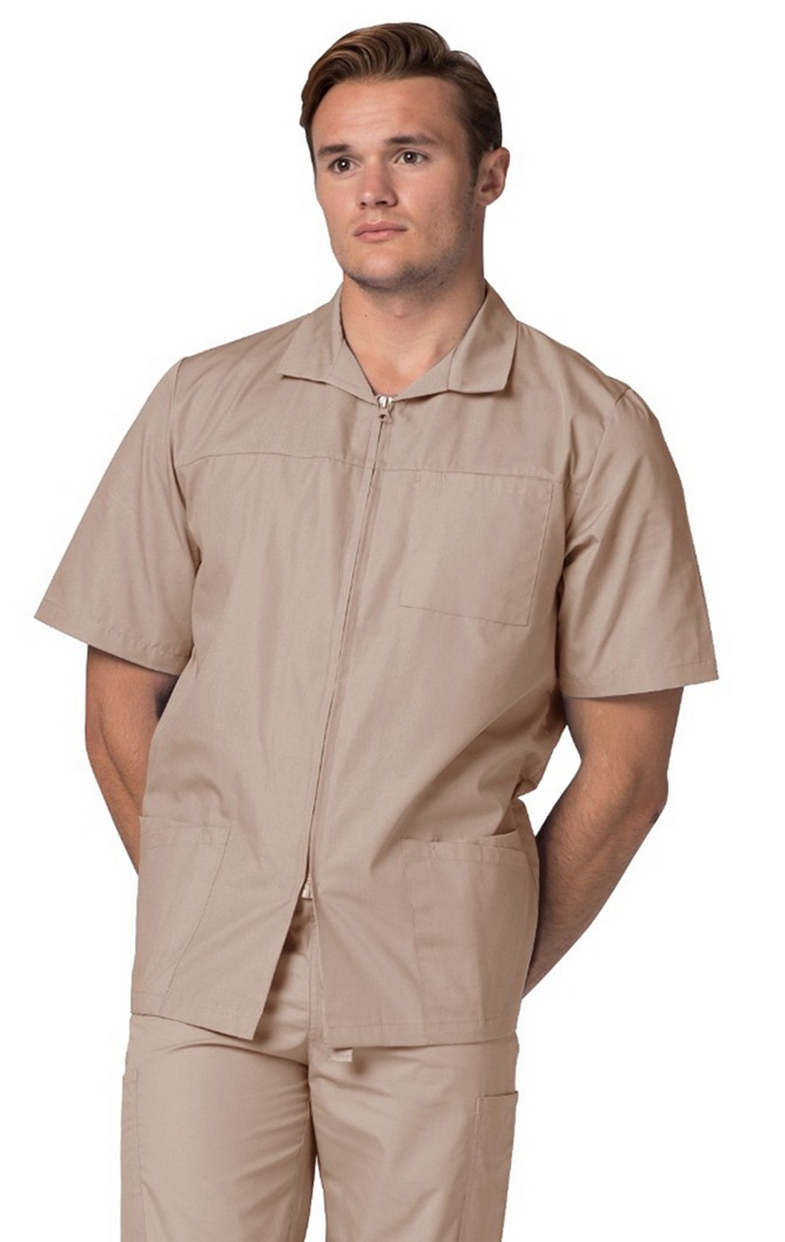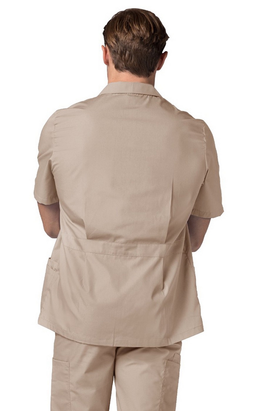 Men's fit, Short sleeved front-zippered jacket features a front yoke, two patch pockets, and a chest pocket with pen divider. Back details include a narrow midriff and a couple of crisp pleats. Center back length 29"