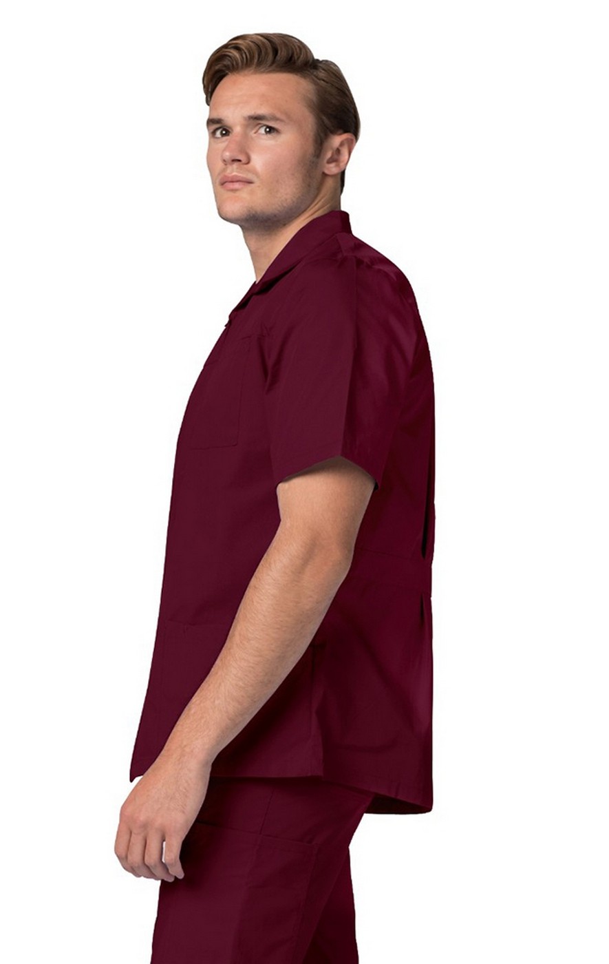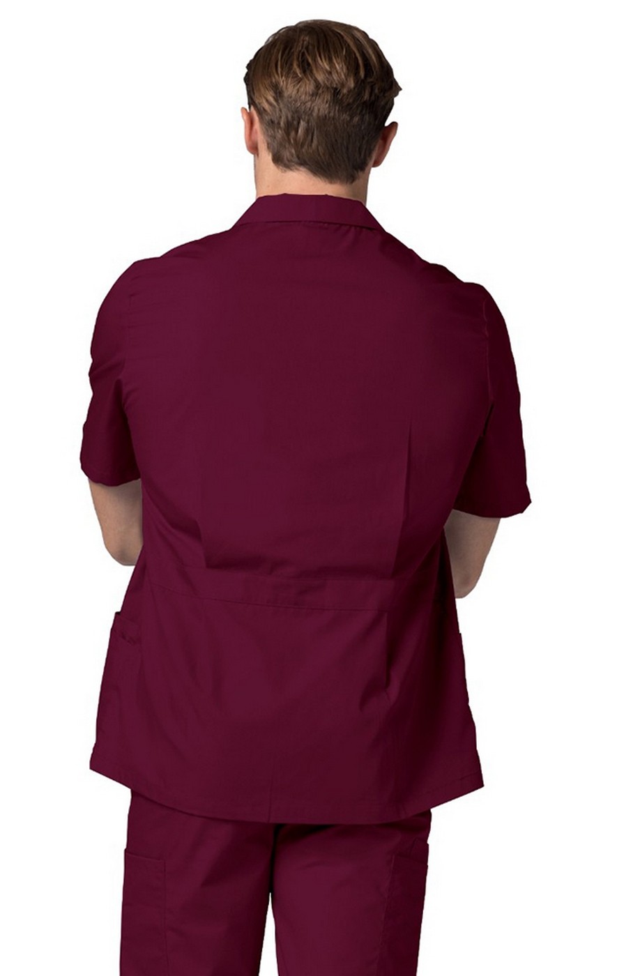 Men's fit, Short sleeved front-zippered jacket features a front yoke, two patch pockets, and a chest pocket with pen divider. Back details include a narrow midriff and a couple of crisp pleats. Center back length 29"