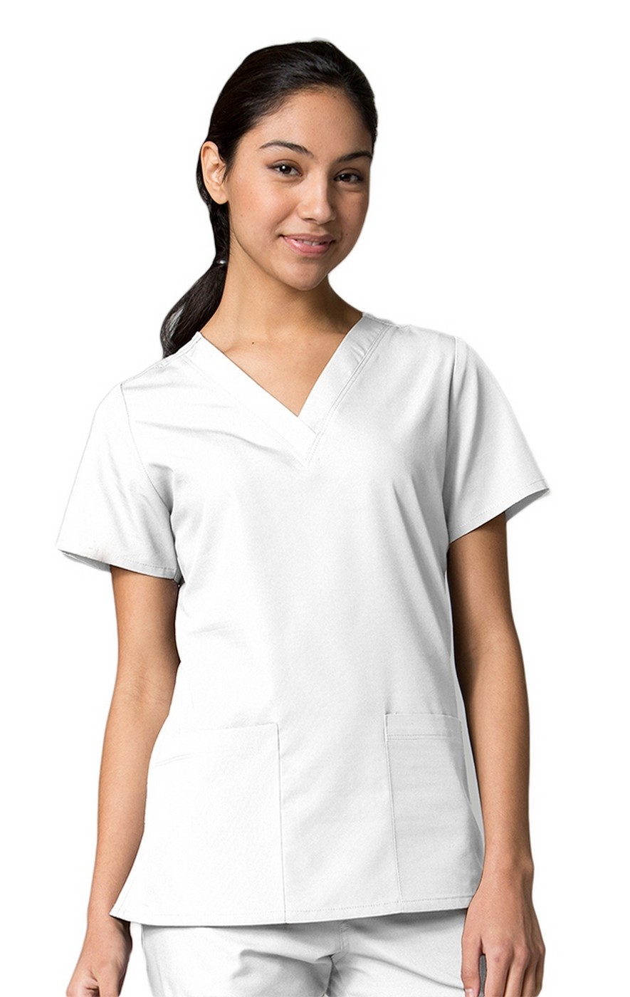 Basic V-neck top. Two front patch pockets. Double needle stitching at shoulder and pocket. Inner utility loop at pocket. Side vents.