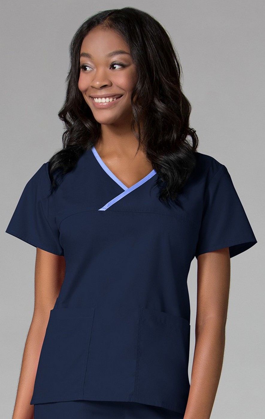 Constructed with Maevn's superior plain weave poplin fabric. Mock wrap top with contrast detailing. Two lower pockets and one elevated smart phone pocket. Double stitched at shoulders,front yoke seam and front pockets for durability. Set in sleeves for mobility. Inner utility tape at front pocket. Tagless for added comfort. SIZES: XXS - 5XL. LENGTH: 26 1/4". FABRIC: 65% Polyester 35% Cotton.