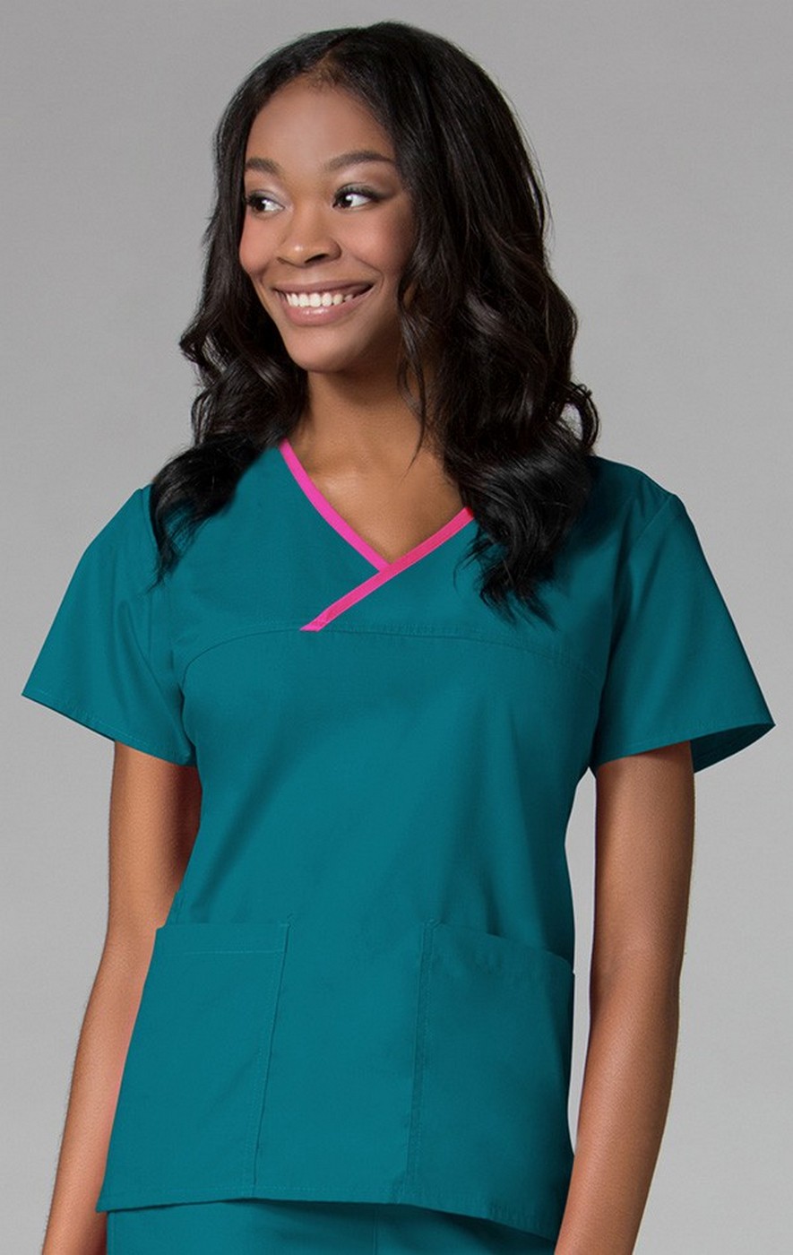Constructed with Maevn's superior plain weave poplin fabric. Mock wrap top with contrast detailing. Two lower pockets and one elevated smart phone pocket. Double stitched at shoulders,front yoke seam and front pockets for durability. Set in sleeves for mobility. Inner utility tape at front pocket. Tagless for added comfort. SIZES: XXS - 5XL. LENGTH: 26 1/4". FABRIC: 65% Polyester 35% Cotton.