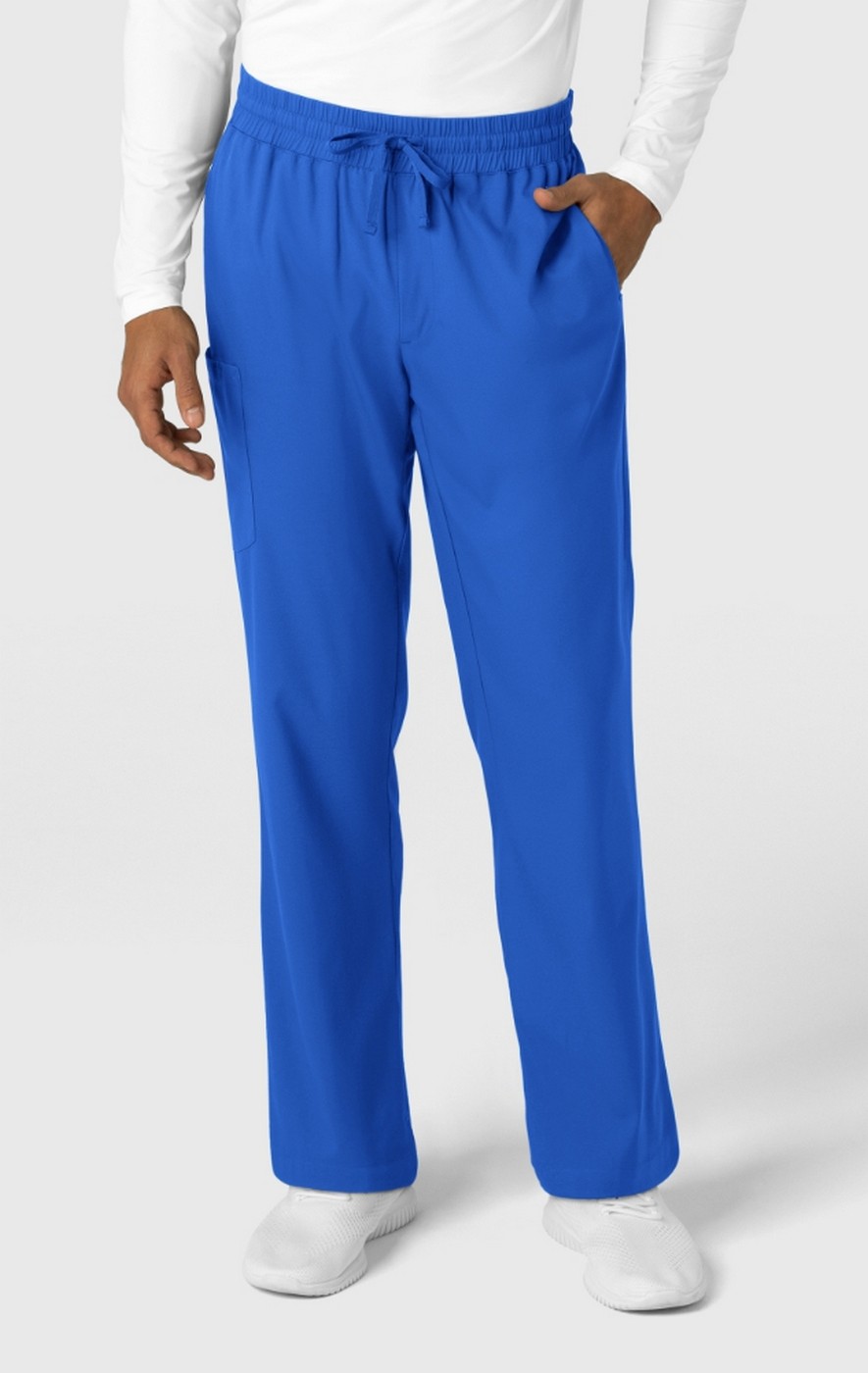 Fresh, modern, classic. These men's straight-leg scrub pants merge on-trend style with the functionality you need to be successful every shift. They're fabricated from a soft and stretchy fabric that's sustainably made, letting you feel good about doing your part to help protect the planet while you care for your patients. Get a customized, adjustable fit with a drawstring on the waist, which is made with a wide elastic band for comfort that never digs in or restricts your movement. Keep everything you need right by your side with two side-entry pockets plus a small security pocket that helps secure valuables you'd rather stay with you. A cargo pocket includes a bartack stitch for your pen. Internal vent slits let your scrub pants rest easy over your shoes, elongating the silhouette for a clean-lined drape. Built for bold confidence, these scrub pants give you the versatility you're looking for to make every shift one you can feel good about when it's done.