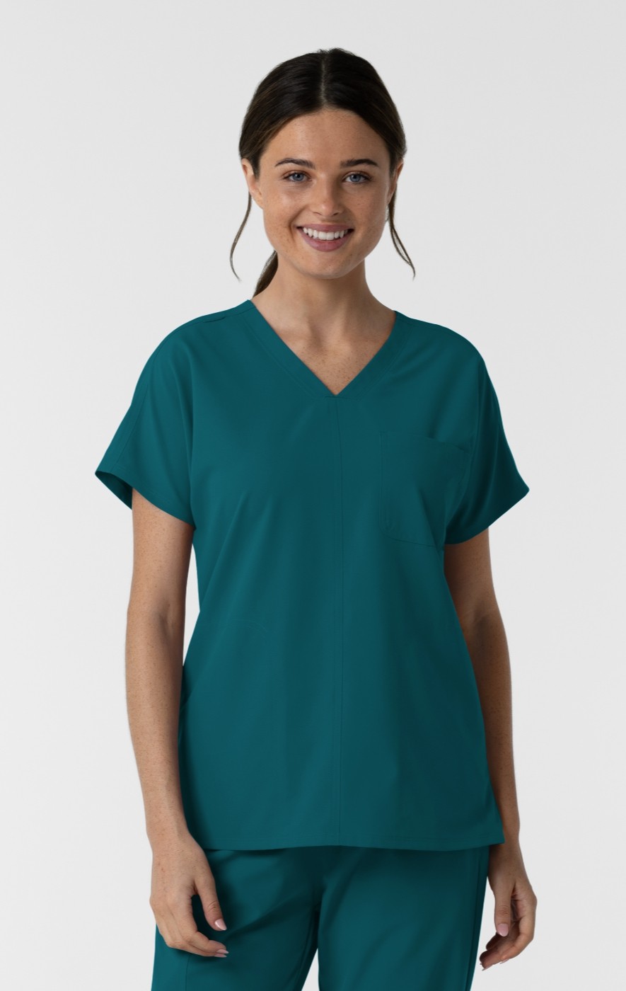 When you're in a caring profession, every day looks a little bit different. This women's scrub top is comfortable and functional enough to move through it all with ease. Crafted from a crisp polyester poplin fabric, it offers a polished and professional appearance while ensuring breathability and all-day comfort. The classic V-neck design is enhanced with a conveniently placed badge loop at the front, ensuring your ID is always visible and easily accessible. This thoughtful detail streamlines identification processes and enhances workplace efficiency. Multiple pockets, strategically placed for optimal convenience, provide ample storage for essential tools, notes, and personal items. A dedicated pen slot ensures you're always prepared to take notes or jot down important information. The comfortable fabric and practical design features work together to enhance your workday, allowing you to focus on what matters most: providing exceptional care. With its combination of classic style and functional design, this scrub top is a valuable addition to any healthcare professional's wardrobe.
