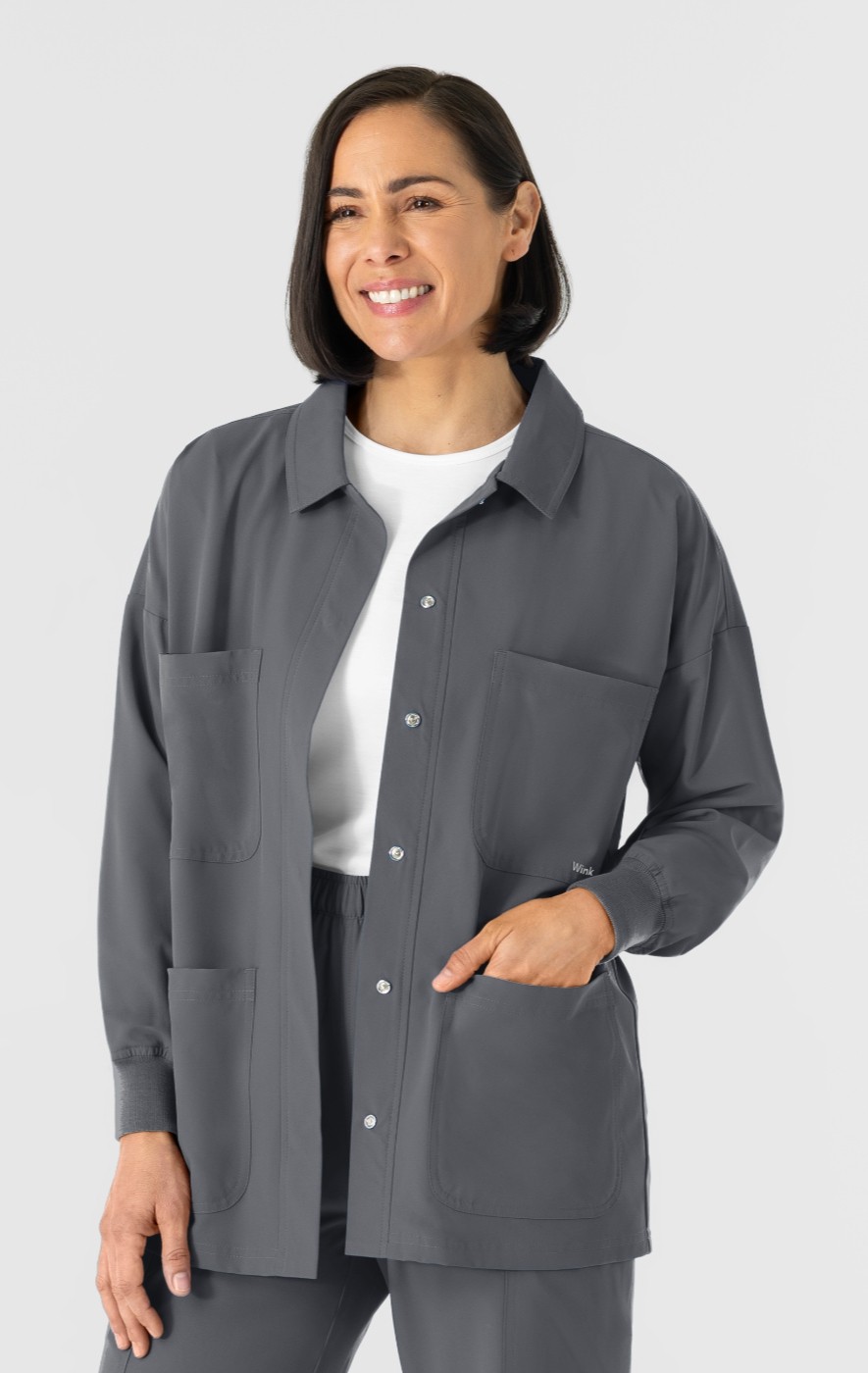 This women's scrub jacket is designed to seamlessly integrate with your existing scrubs, adding a layer of versatile functionality to your work wardrobe. Crafted from a crisp poplin material, it offers a polished and professional look that complements your scrubs while providing added warmth and coverage. The jacket features hidden snap buttons for easy on and off, allowing for quick adjustments throughout your busy day. Practicality is a key focus, with four front patch pockets providing ample storage for essential tools, notes, and personal items. These pockets are strategically placed for easy access, ensuring you can quickly retrieve what you need without disrupting your workflow. The crisp poplin fabric provides a polished look, while the hidden snap buttons and multiple pockets enhance convenience and practicality. Whether you're navigating a chilly facility or simply need an extra layer of warmth, this jacket is a reliable and stylish choice.