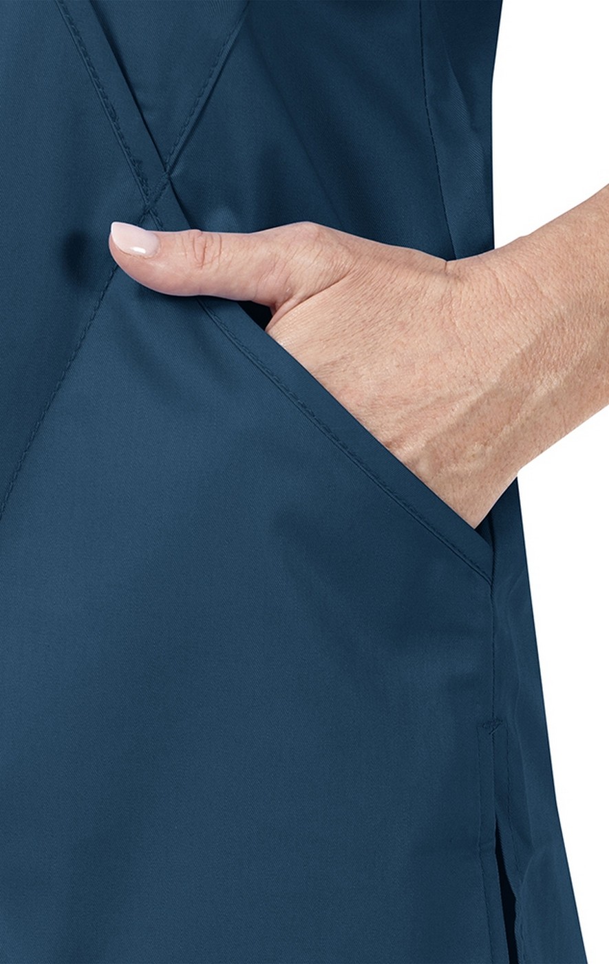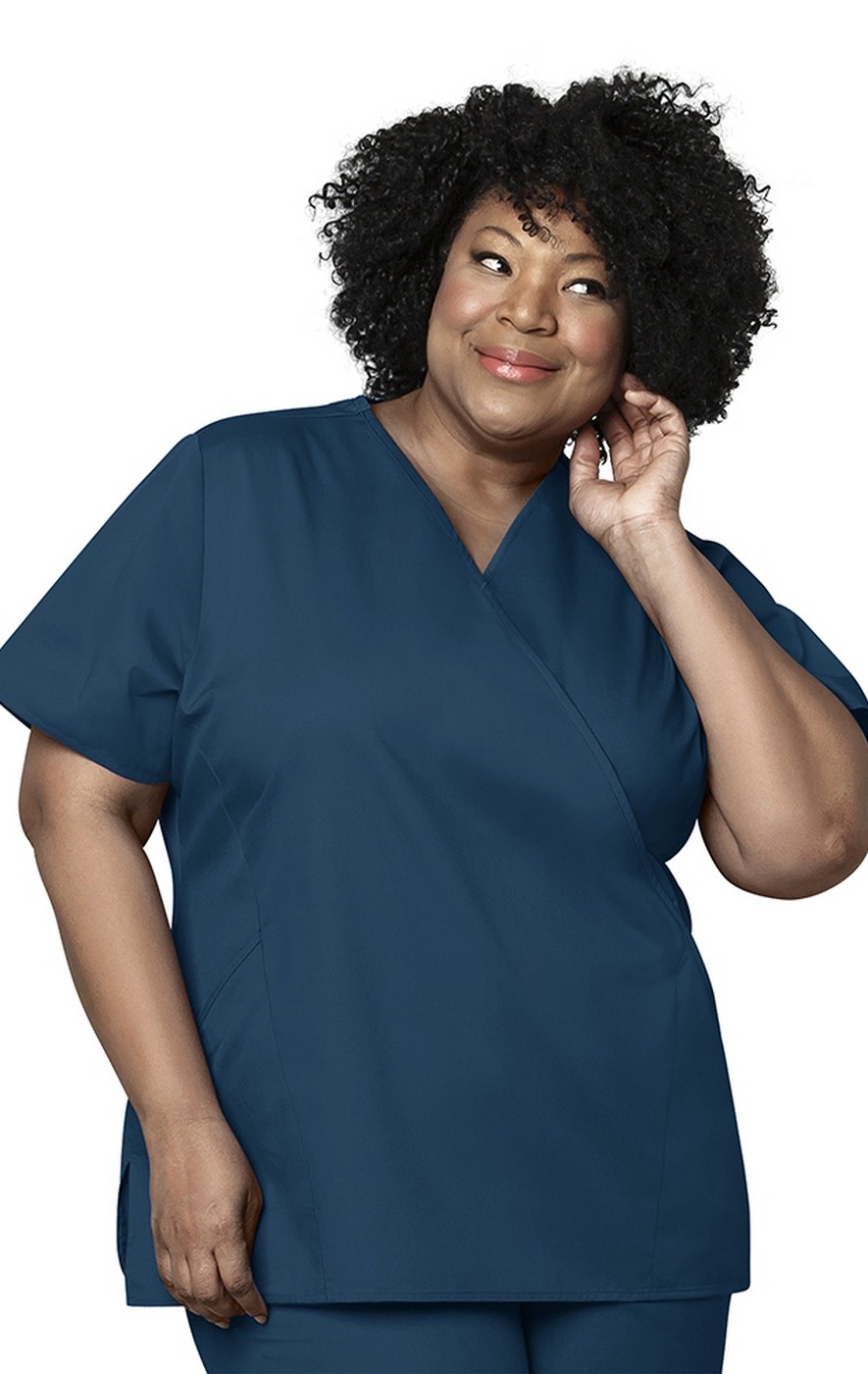 No fashion silhouette flatters quite like a wrap. The WonderWink women’s mock wrap scrub top from the WonderWORK collection borrows that slimming style and adds sporty princess seaming to perfect the shape. Two large front slash pockets integrate perfectly with the lines of the faux wrap, providing oodles of hands-free storage for your accessories. Available in a number of fashionable colors.