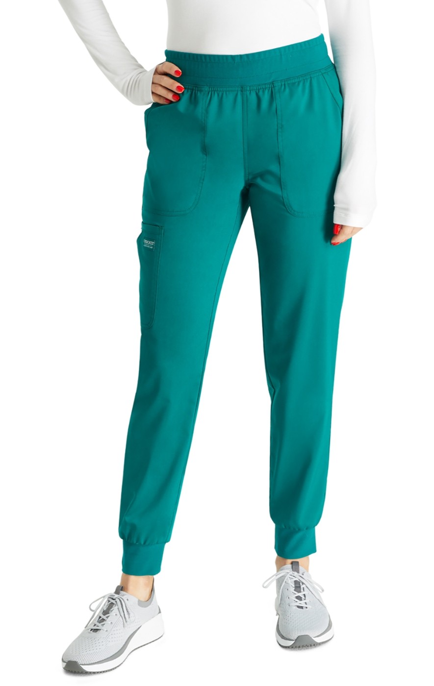 This Modern Classic fit mid rise pull-on jogger has an encased elastic knit waistband with interior drawstring. There are five pockets: two front patch pockets, a double cargo pocket with a bungee ID badge loop, and one back patch pocket. The pant also features a tapered leg and knit cuffs.