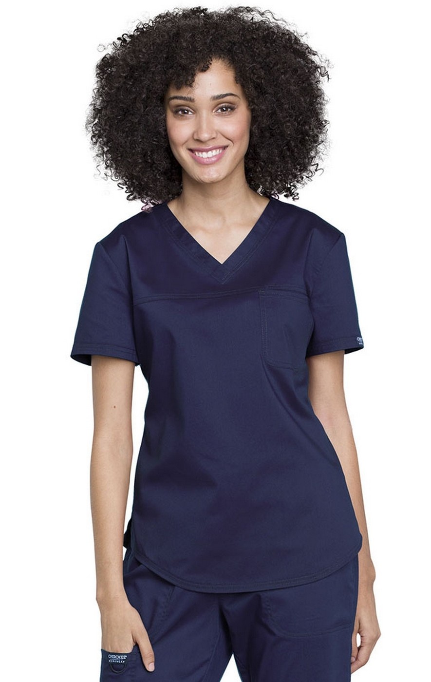 This one-pocket V-neck top is operation room friendly. It has a sleek feminine shape, and features short sleeves and a slightly curved hem, as well as side vents for ease of movement. Modern Classic fit. This style looks great tucked in or untucked.