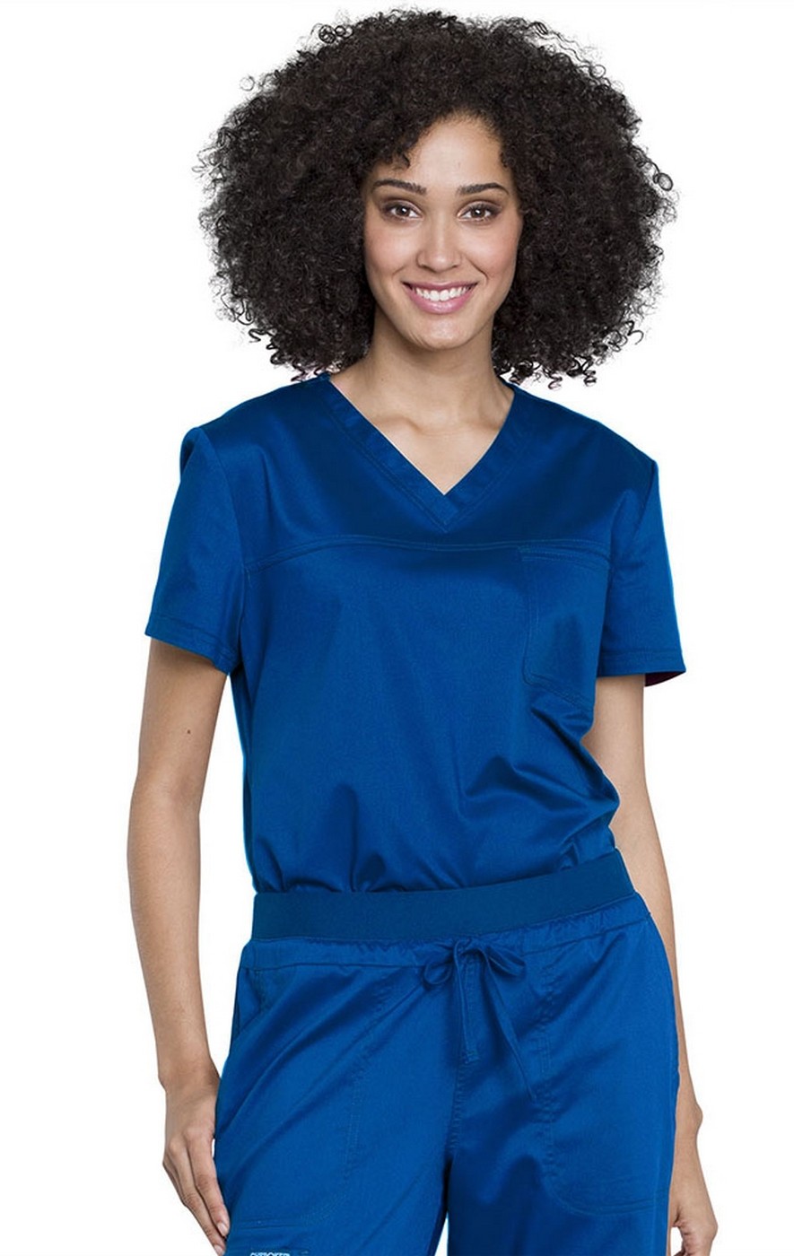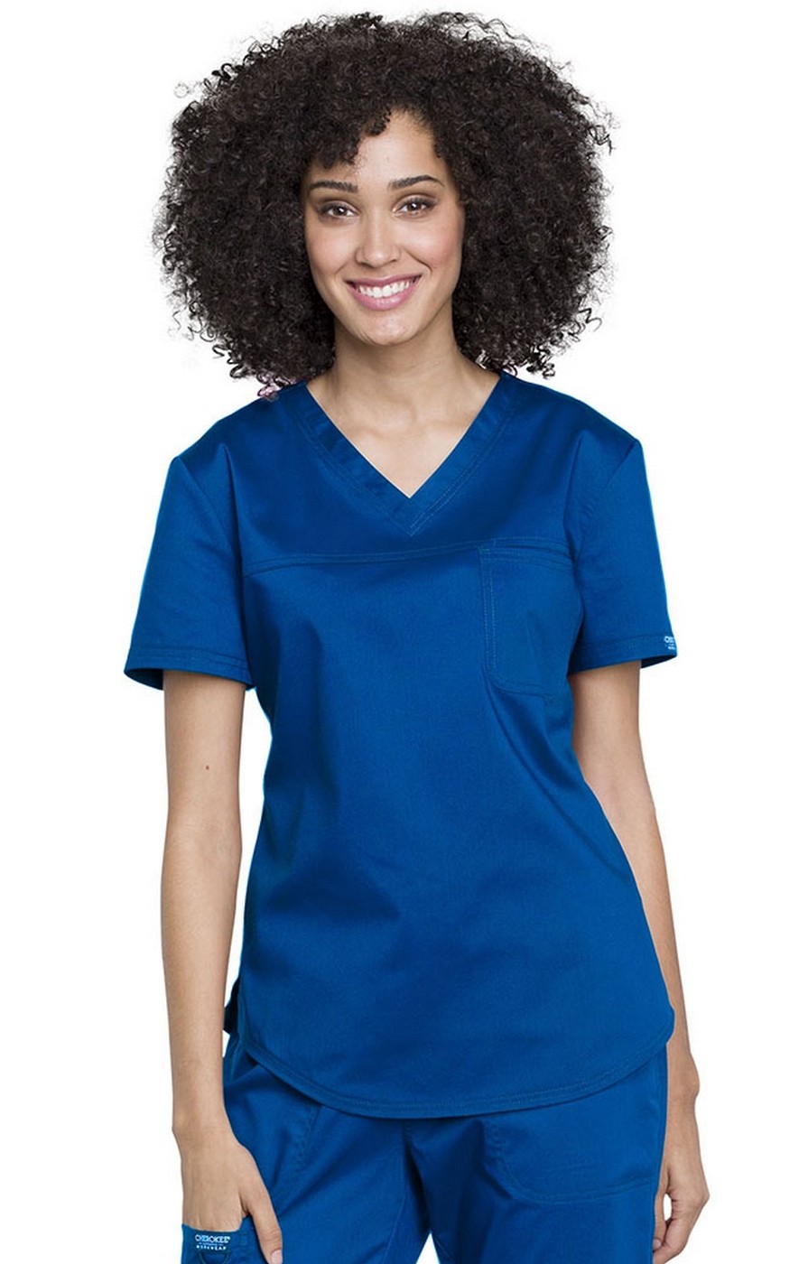 This one-pocket V-neck top is operation room friendly. It has a sleek feminine shape, and features short sleeves and a slightly curved hem, as well as side vents for ease of movement. Modern Classic fit. This style looks great tucked in or untucked.