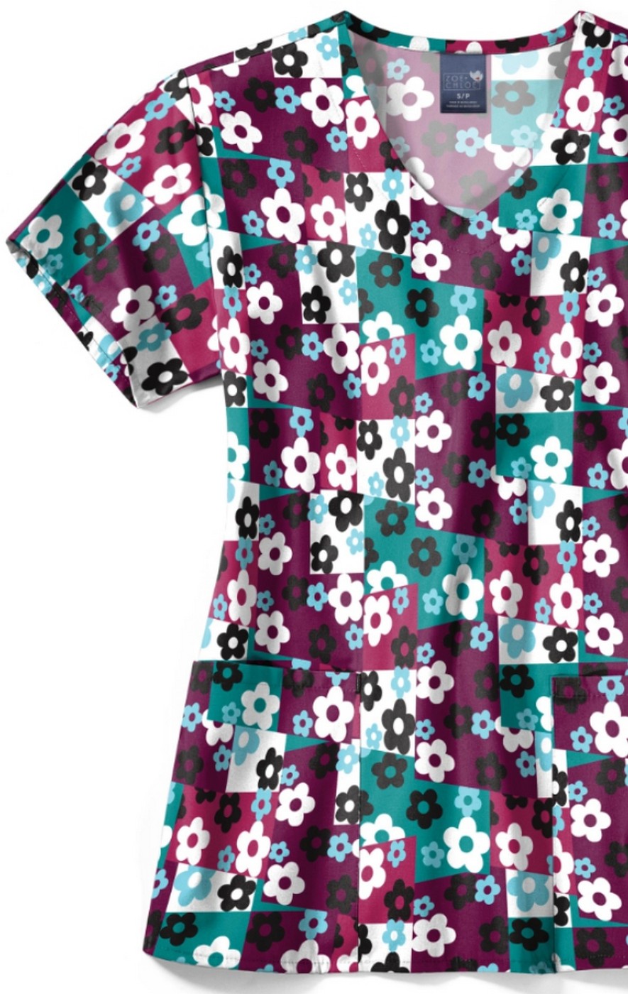 Z12213 Zoe + Chloe Curved V-neck Print Scrub Top - Skater Check Wine