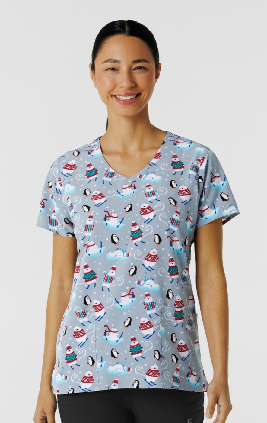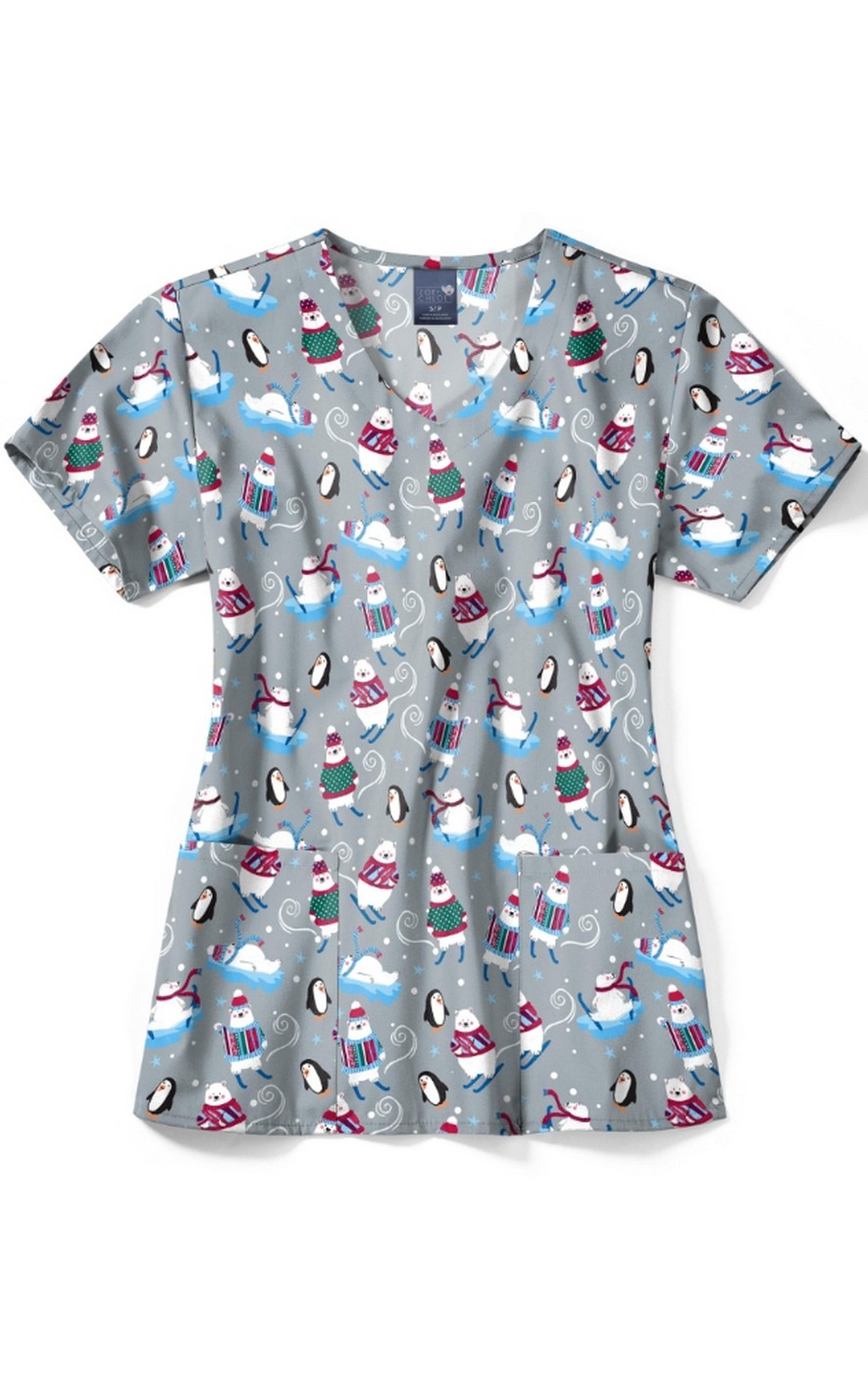 Z12213 Zoe + Chloe Curved V-neck Print Scrub Top - 'Tis the Ski-son