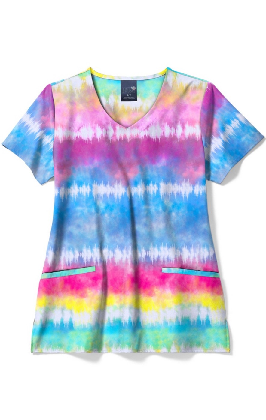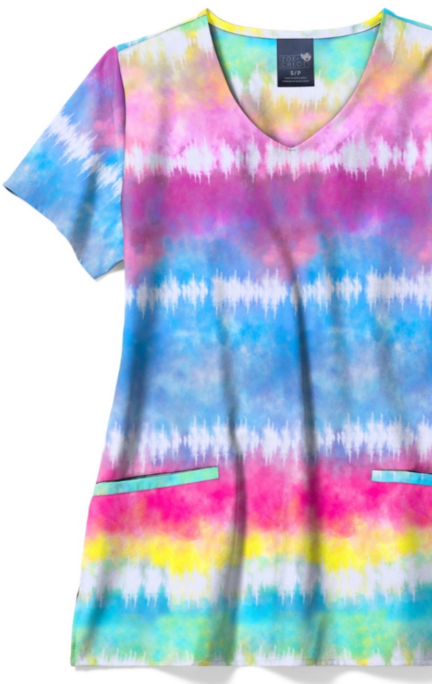 Z18213 Zoe + Chloe Curved V-Neck Print Scrub Top - Chasing Rainbows