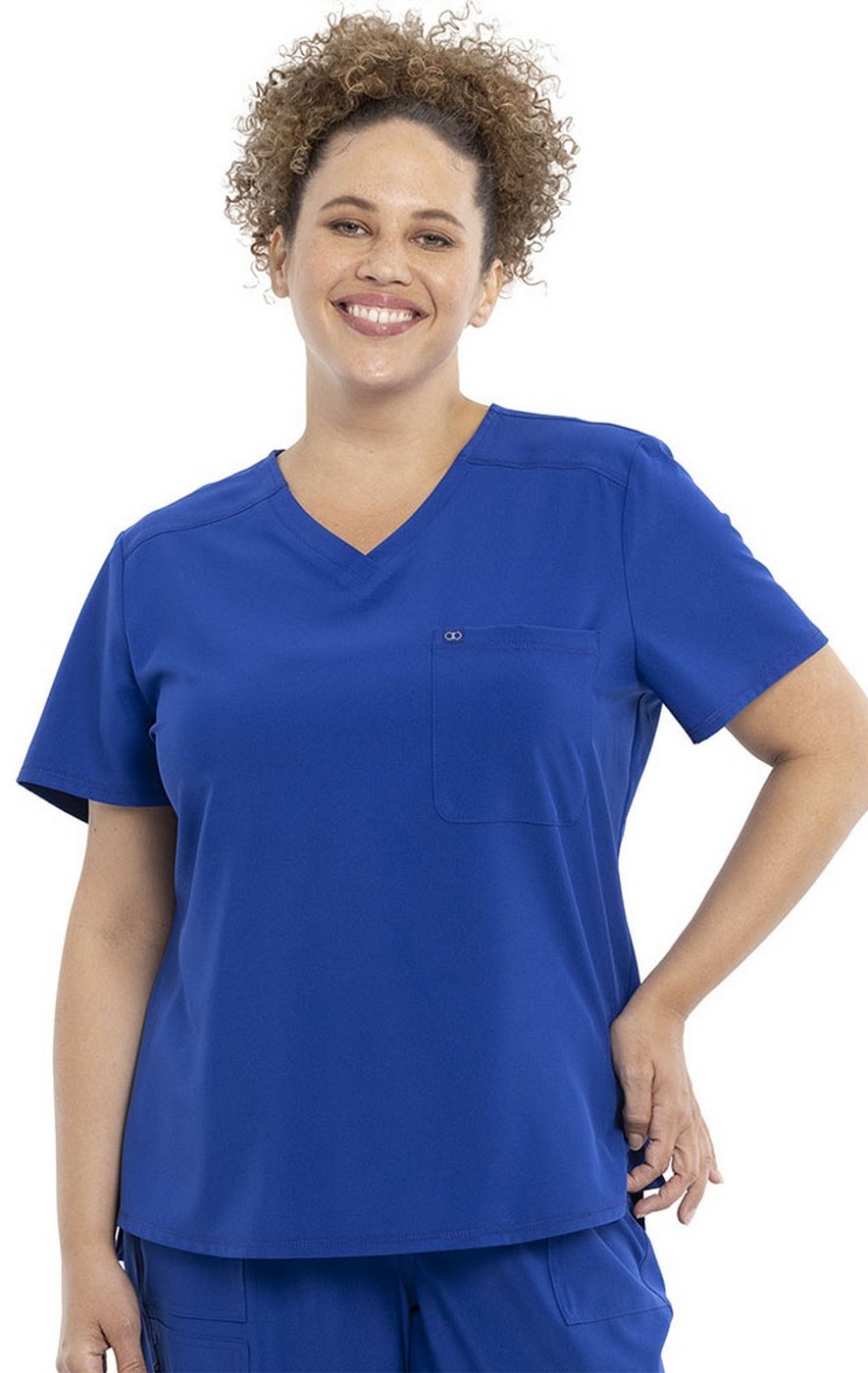 Ce haut à encolure en V Contemporary Fit présente des coutures avant à empiècement, des coutures arrière princesse et un ourlet arrondi et bas. Il y a deux poches: une poche poitrine et une poche arrière zippée de sécurité. Les évents latérales hautes permettent à ce haut d’être à la mode à moitié rentré. Le haut à col en V est également très bien rentré ou pas.
