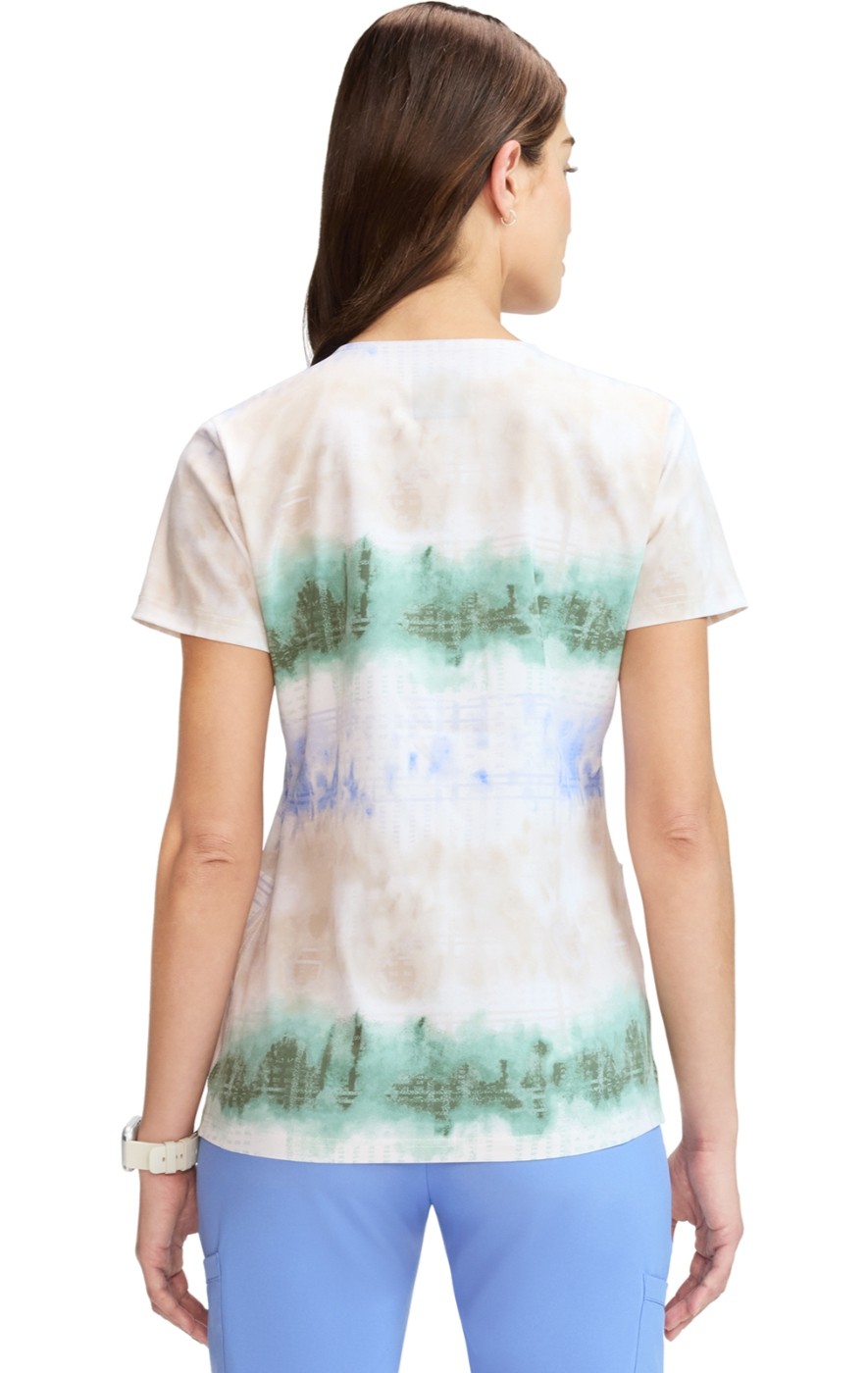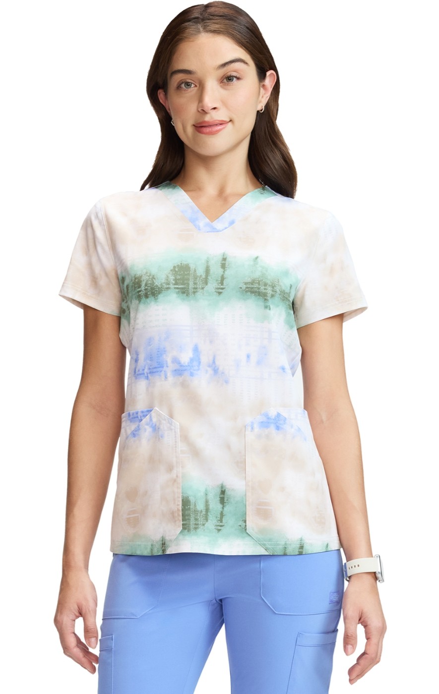 Ce top contemporain à col en V a un total de quatre poches pour le rangement organisé grâce aux doubles poches plaquées. Il y a aussi une fente pour stylo/instrument sur la poche droite du porteur.