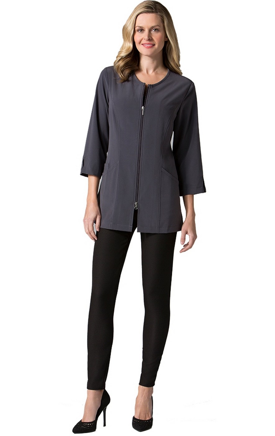 Ligne à col rond et manches 3/4po avec fente. Coutage des coutures avec fermeture à glissière double face. Deux poches courbes avant avec poche pour votre telephone celllulaire. Darts arrière et ceinture arrière pour plus de forme et de style. Orifices latéraux. TAILLE: XXS - 4XL. LONGUEUR: 29,5po. TISSU: 96% Polyester 4% Spandex.