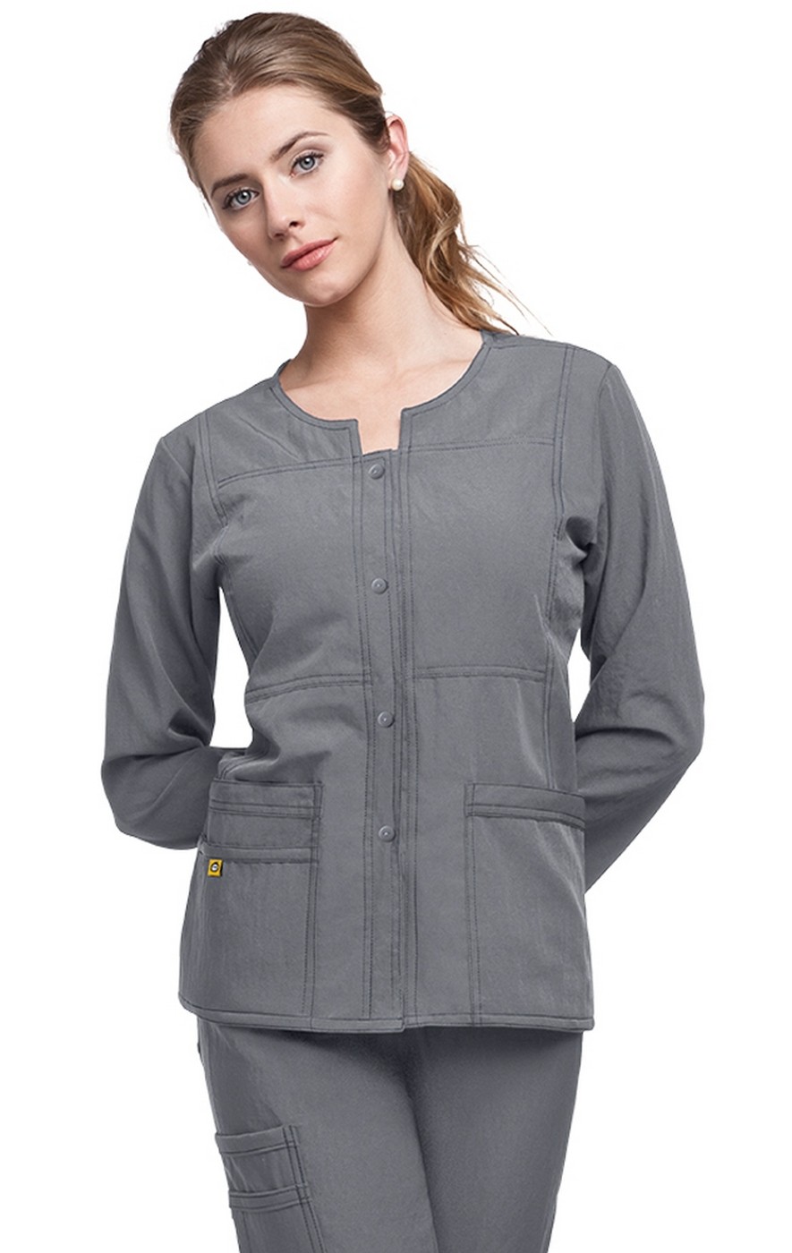 Voici un gilet avec bouton, prêt à travailler! Vous pouvez utiliser ce gilet toute la journée sans quelle soit trop étonnant. Le gilet a une protection anti-frottement. WonderWink présente un décolleté nouveau et un fabric 100% polyester qui apporte une nouvelle vie au bureau de travail. Les manches peuvent généreuses dépasser la distance et cacher les poignets en tricot côtes.